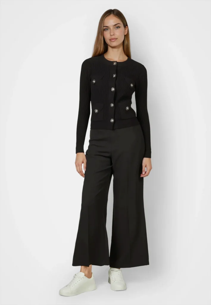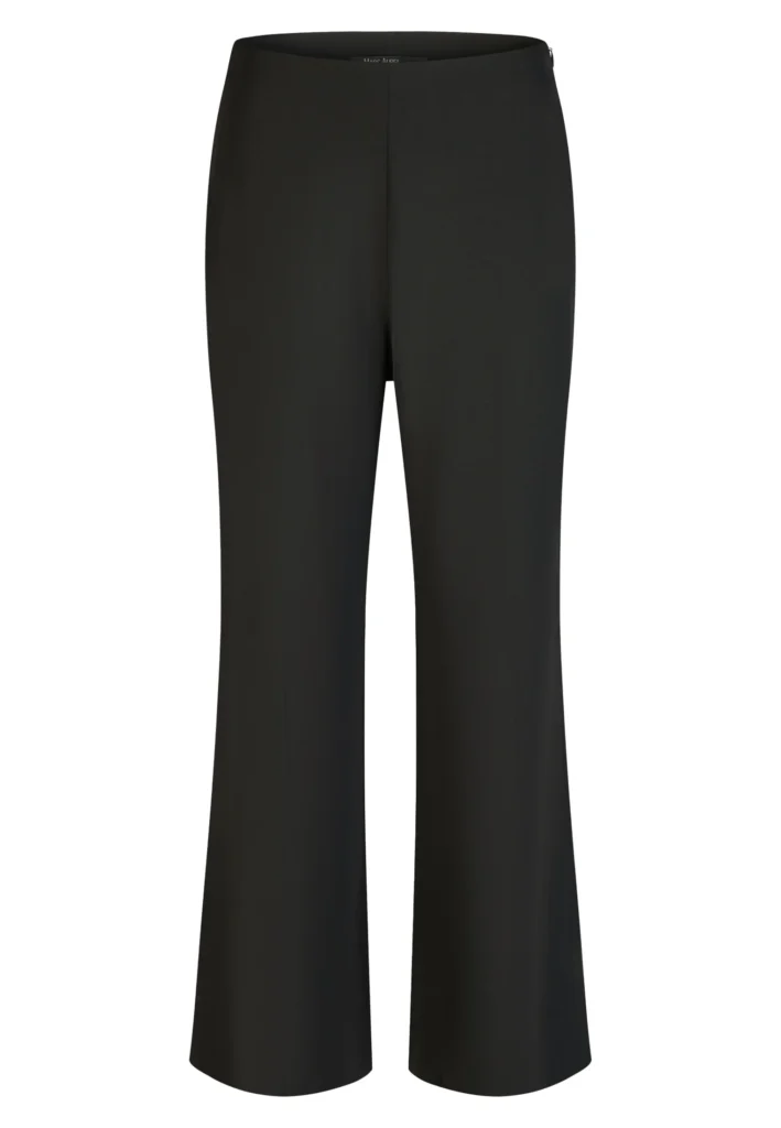 Vācu modes zīmola Marc Aurel melnas nedaudz saīsināta un paplatināta piegriezuma bikses sievietēm. Izgatavotas no mīksta un viegli kopjama augstākās kvalitātes poliestera materiāla. Papildinātas ar rāvējslēdzēja aizdari sānā.