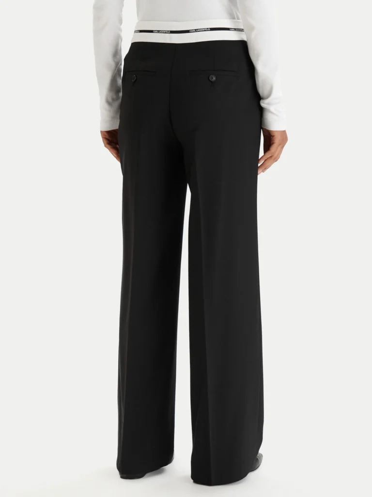 Vācu luksusa zīmola Karl Lagerfeld melnas sieviešu bikses ar baltu jostu un kontrastējošu logo svītras akcentu. Izgatavotas no smalka un elastīga vilnas auduma. Papildinātas ar slēptu aizdari un ielocēm.