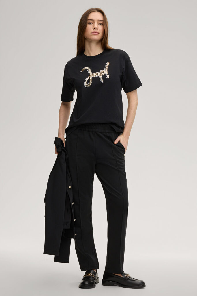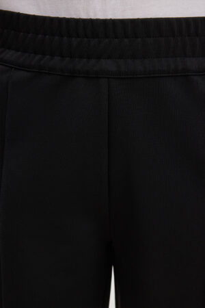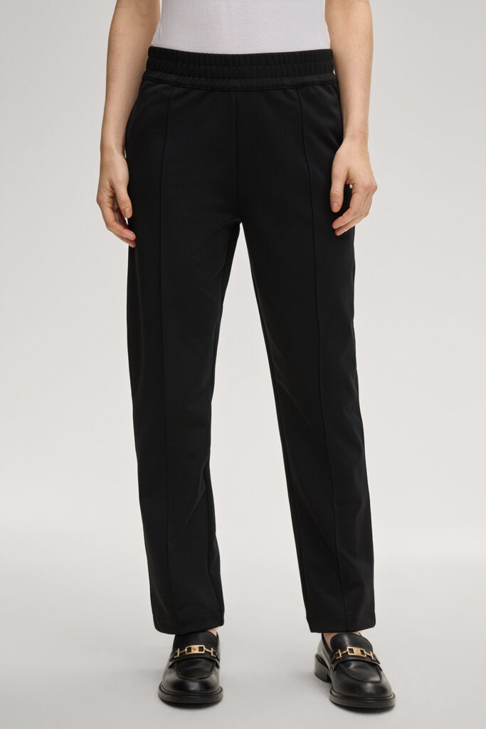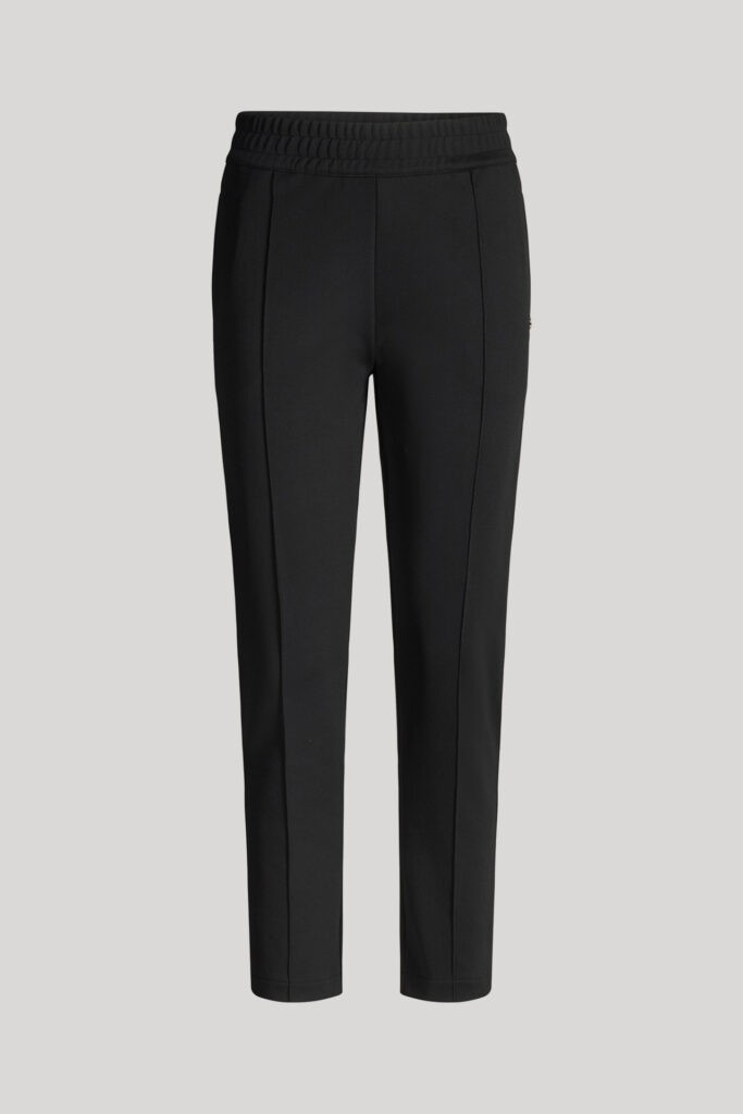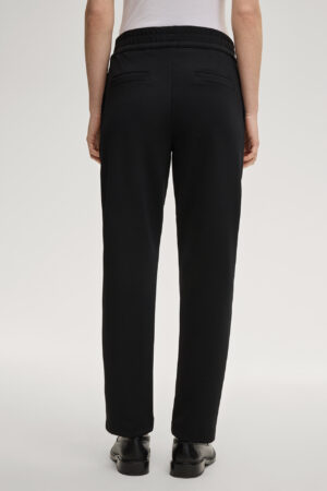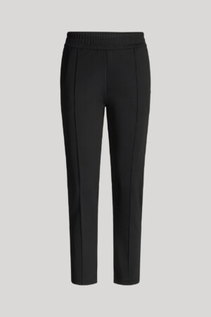 Vācu modes zīmola Joop! melnas sieviešu sportiskā stila bikses ar elastīgu jostasvietu. Izgatavotas no viegli elastīga kokvilnas maisījuma materiāla. Akcentētas ar vertikālām nošuvēm un smalku logo emblēmu pie sānu kabatas.