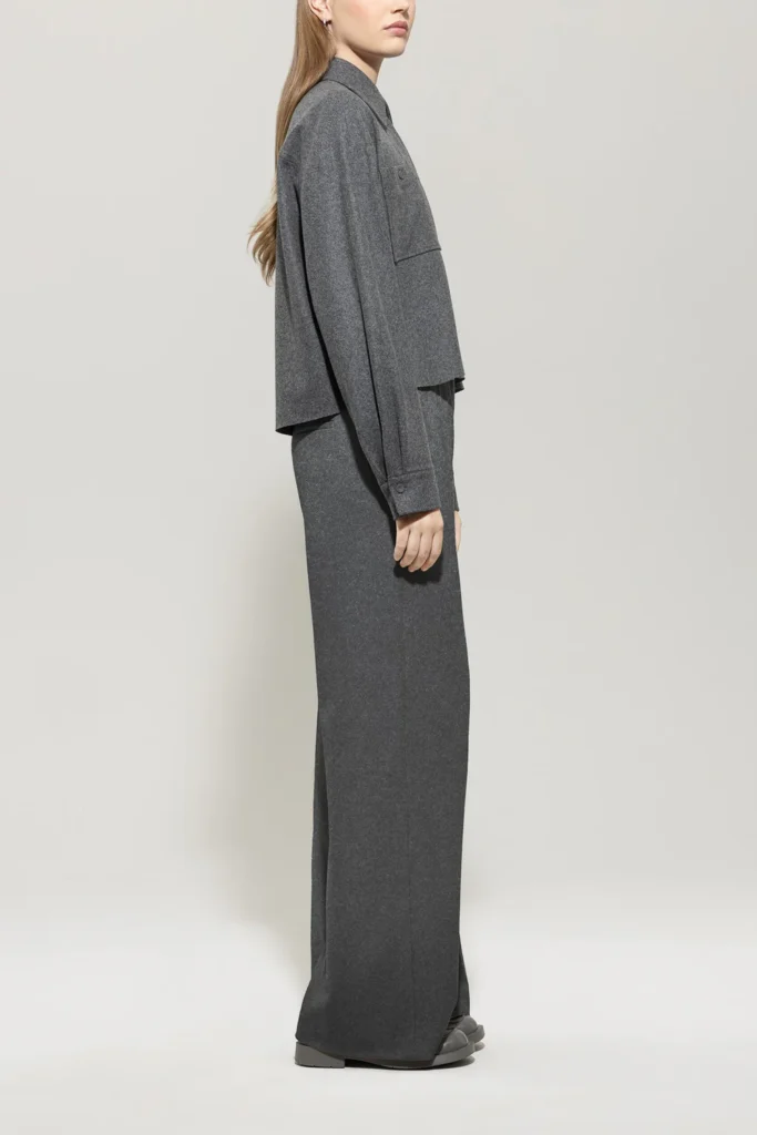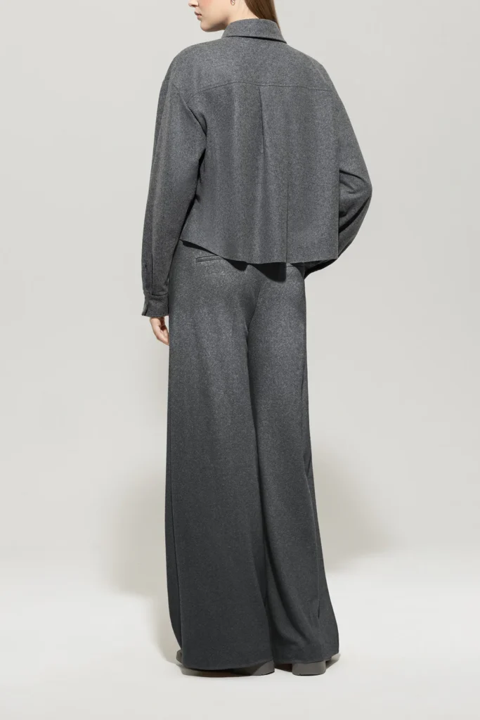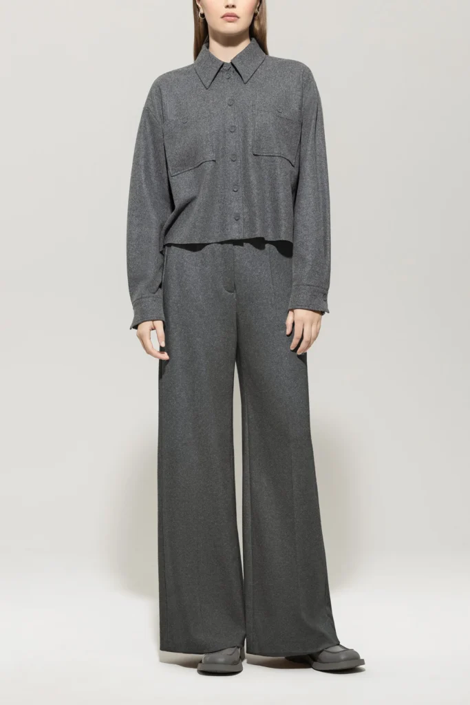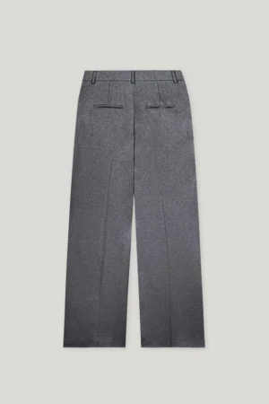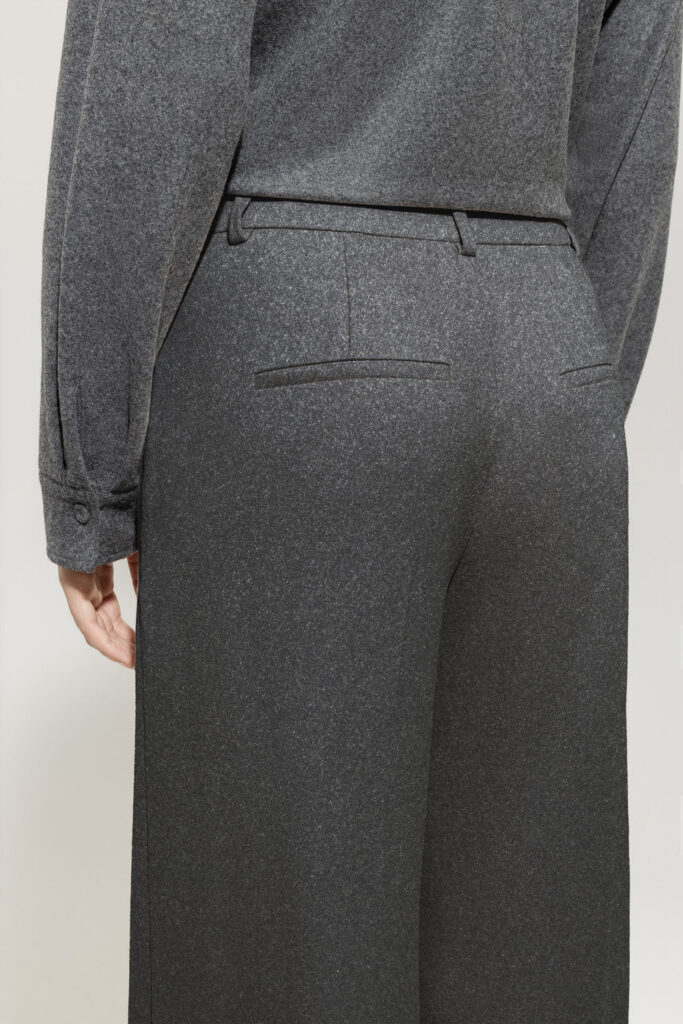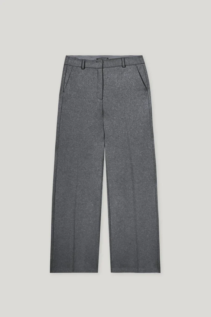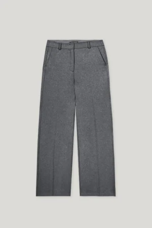 Vācu premium klases apģērbu zīmola Luisa Cerano platas sieviešu bikses tumši pelēkā krāsā. Izgatavotas no mīksta un elastīga vilnas maisījuma flaneļa materiāla. Papildinātas ar iešūtām sānu un dekoratīvām mugurpuses kabatām.
