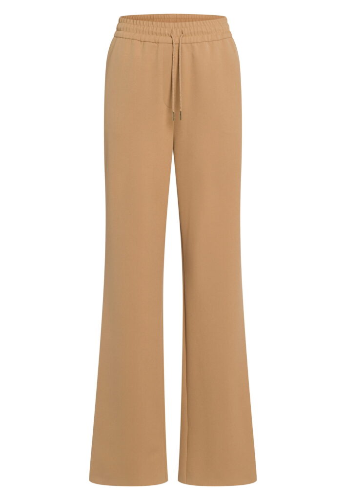 Vācu modes zīmola Marc Aurel pidžamas stila sieviešu bikses bēšā krāsā. Izgatavotas no viegli elastīga poliestera tvilla auduma. Papildinātas ar elastīgu, sasienamu jostasvietu un iešūtām sānu kabatām.