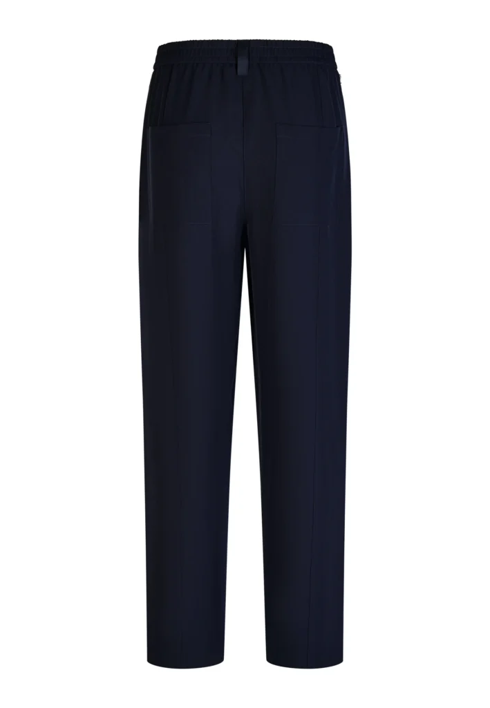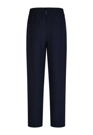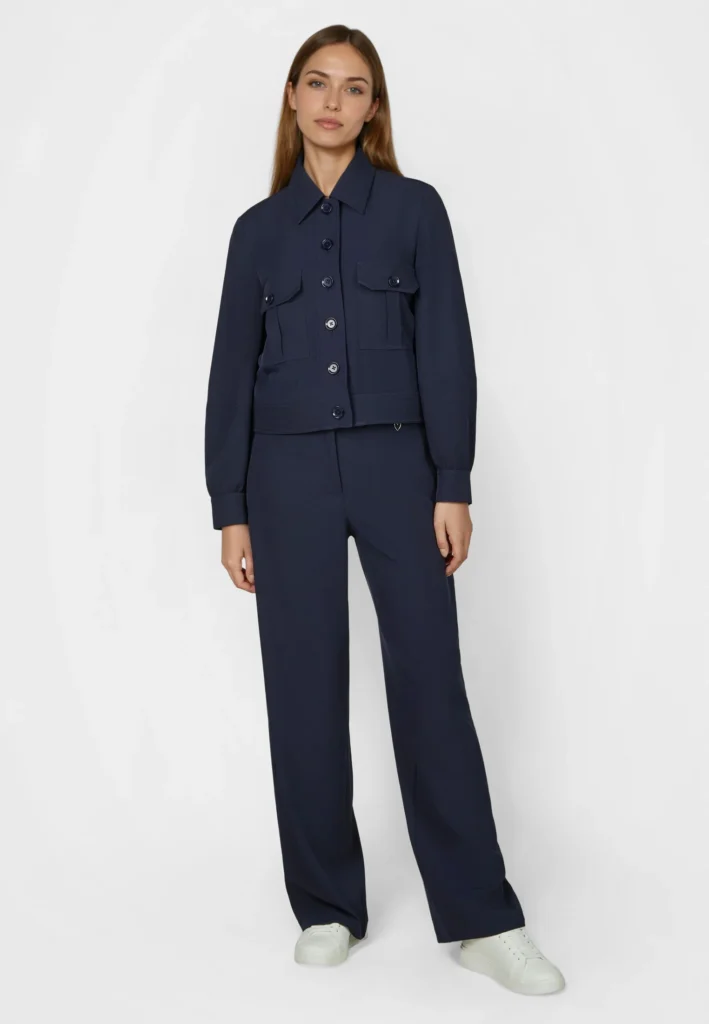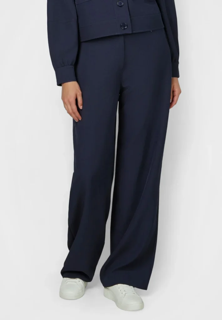 Vācu modes zīmola Marc Aurel tumši zilas sieviešu bikses ar daļēji elastīgu jostasvietu. Izgatavotas no viegla, plūstoša un elastīga poliestera materiāla. Papildinātas ar rāvējslēdzēju aizdares sānu kabatām un uzšūtām mugurpuses kabatām. Akcentētas ar smalku sudraba krāsas sirdsveida logo akcentu pie jostas cilpas.