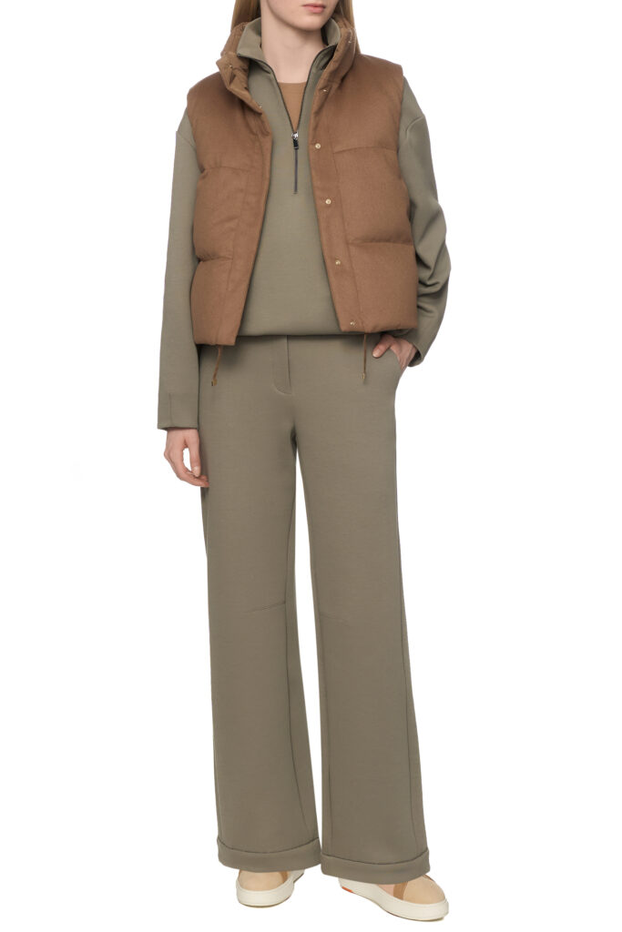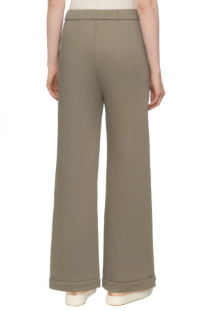 Itāļu modes zīmola MM by Max Mara plata piegriezuma sieviešu bikses zaļganpelēkā krāsā. Izgatavotas no bieza un blīva kokvilnas maisījuma materiāla. Papildinātas ar mugurpusē elastīgu jostasvietu, sānu kabatām un dubultām apakšmalām.