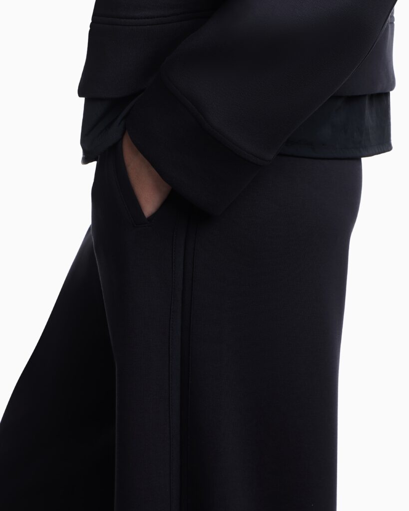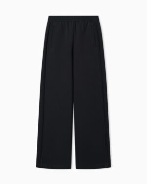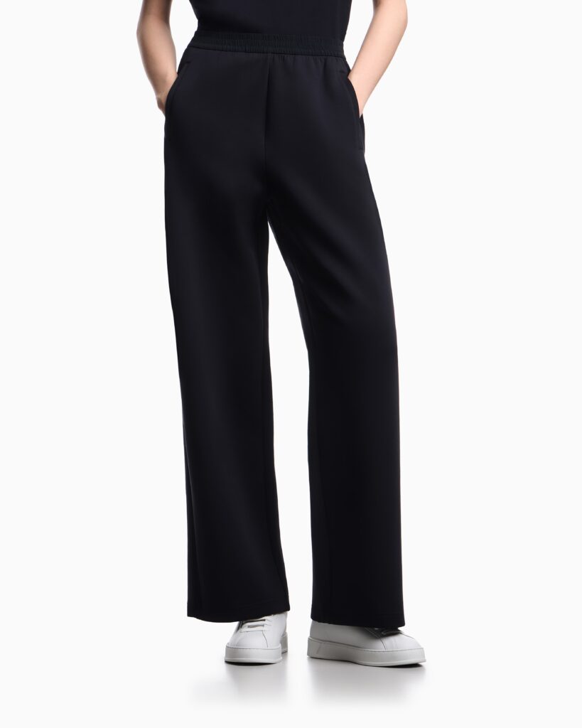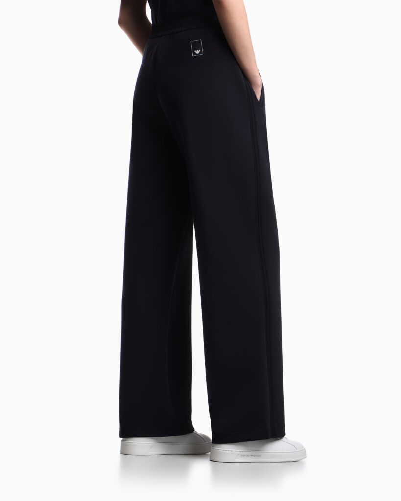Itāļu luksusa zīmola Emporio Armani tumši zilas sieviešu sportiskā stila bikses ar elastīgu jostasvietu no Travel Essential kolekcijas. Izgatavotas no blīva un elastīga kokvilnas maisījuma džersija auduma. Akcentētas ar kontrastējošu zīmola emblēmu mugurpusē.