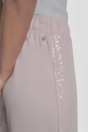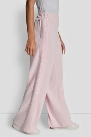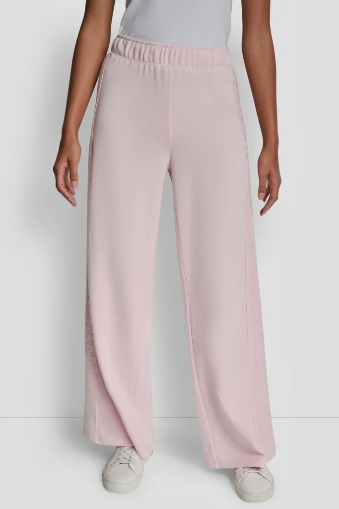 ASV modes zīmola DKNY gaiši rozā plata piegriezuma sieviešu bikses ar elastīgu jostasvietu un caurspīdīgu fliteru apdares joslu sānos. Izgatavotas no mīksta kokvilnas maisījuma materiāla. Papildinātas ar smalku sudraba krāsas logo akcentu pie jostasvietas.