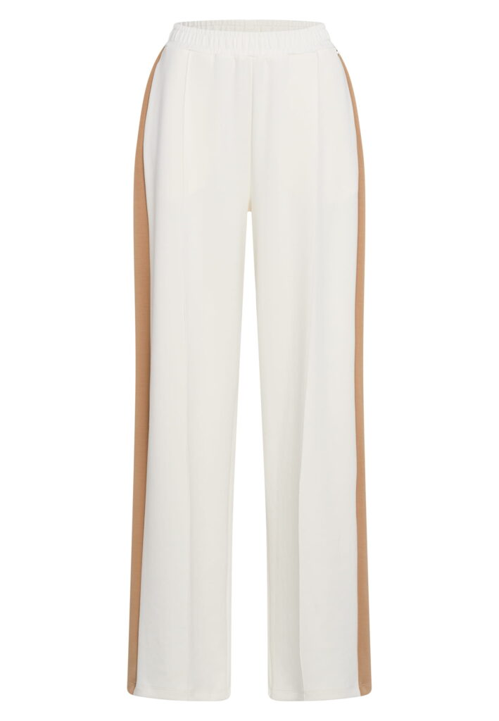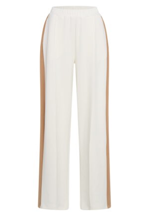 Vācu modes zīmola Marc Aurel krēmbaltas sportiskā stila sieviešu bikses ar elastīgu jostu un vertikālām nošuvēm. Akcentētas ar smilšu brūnu sānu joslu un smalku logo akcentu pie jostas.