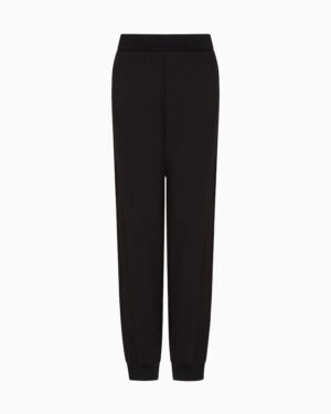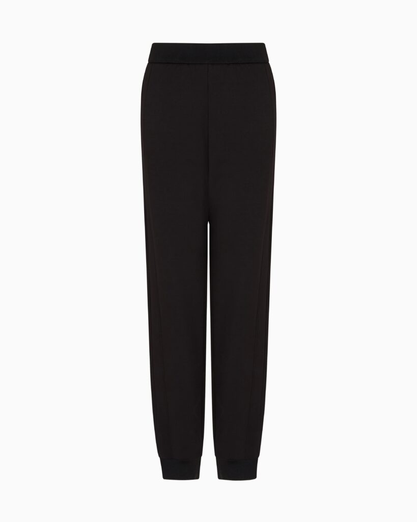 Itāļu luksusa zīmola Emporio Armani melnas sieviešu sportiskā stila bikses no Travel Essentials kapsulkolekcijas. Izgatavotas no blīva un mīksta džersija auduma ar smalki rievotu jostas un apakšmalu apdari. Papildinātas ar sānu kabatām un zīmola logotipa akcentu mugurpusē.
