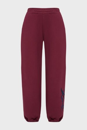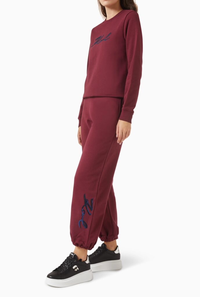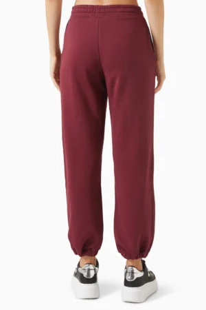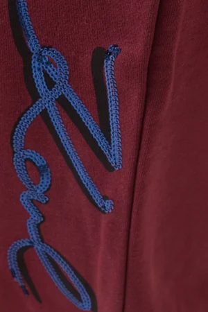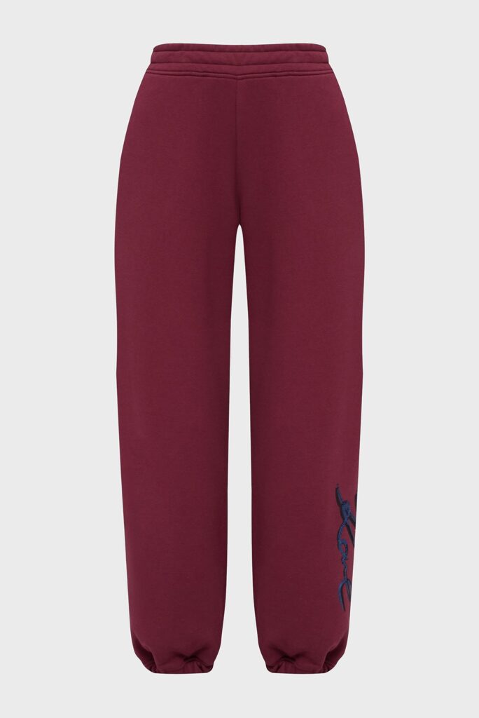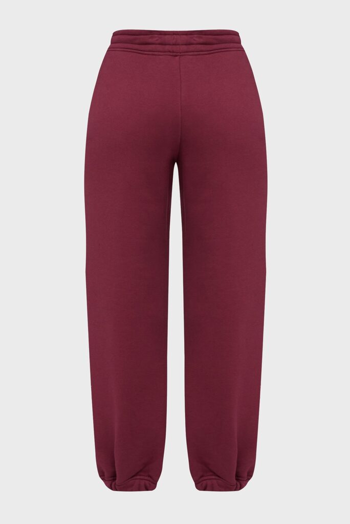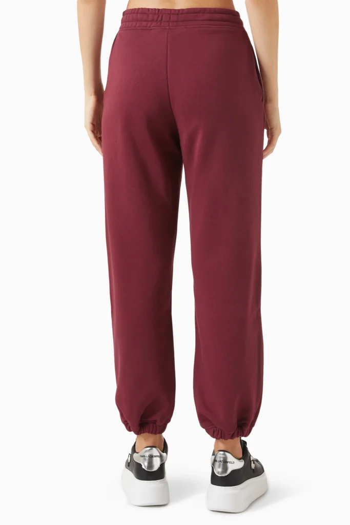 Vācu luksusa zīmola Karl Lagerfeld sieviešu sportiskā stila bikses bordo krāsā. Izgatavotas no blīva un mīksta kokvilnas maisījuma materiāla ar mīkstu frotē struktūras iekšpusi. Akcentētas ar Karl dizaina logotipu tumši zilu fliteru apdarē.