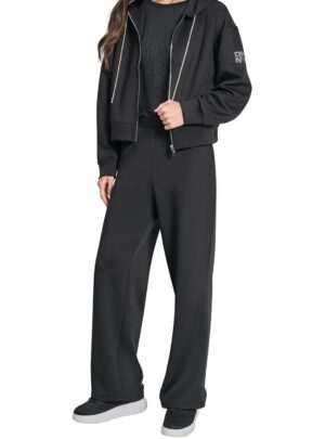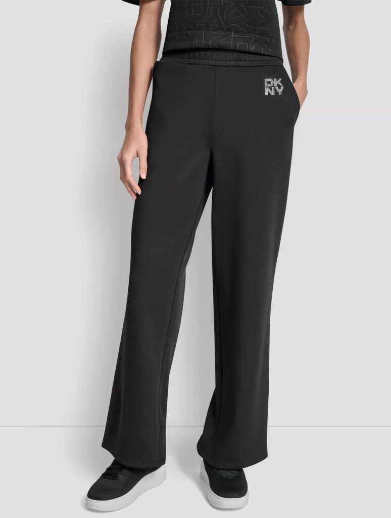 ASV modes zīmola DKNY melnas sieviešu sportiskā stila bikses ar elastīgu jostasvietu. Izgatavotas no blīva un elastīga poliestera materiāla. Papildinātas ar spoži mirdzošu zīmola logotipa akcentu pie kabatas.