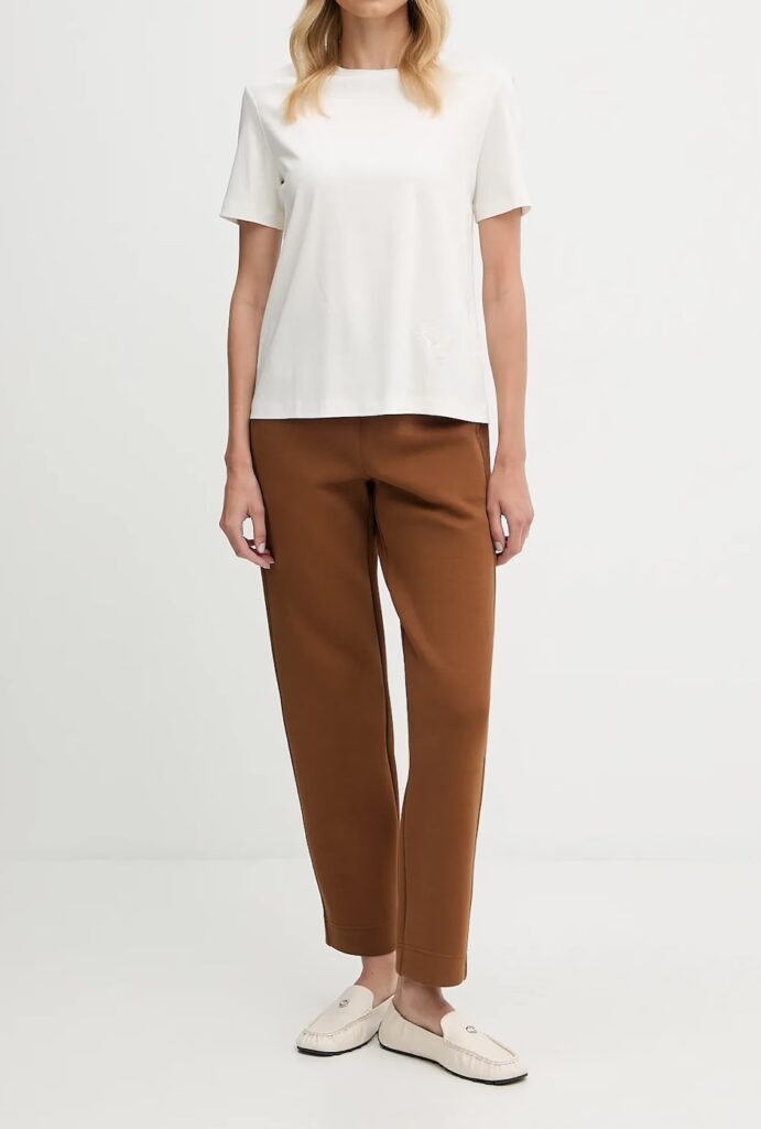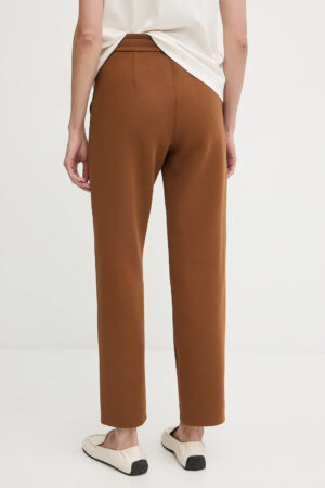 Itāļu modes zīmola MM by Max Mara sieviešu sportiskā stila bikses zeltaini brūnā krāsā. Izgatavotas no blīva kokvilnas maisījuma materiāla. Papildinātas ar elastīgu sasienamo jostu un iešūtām sānu kabatām.