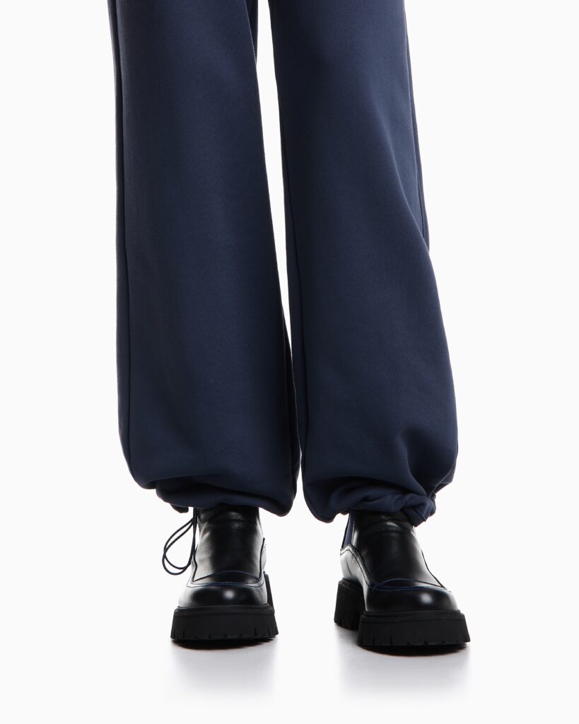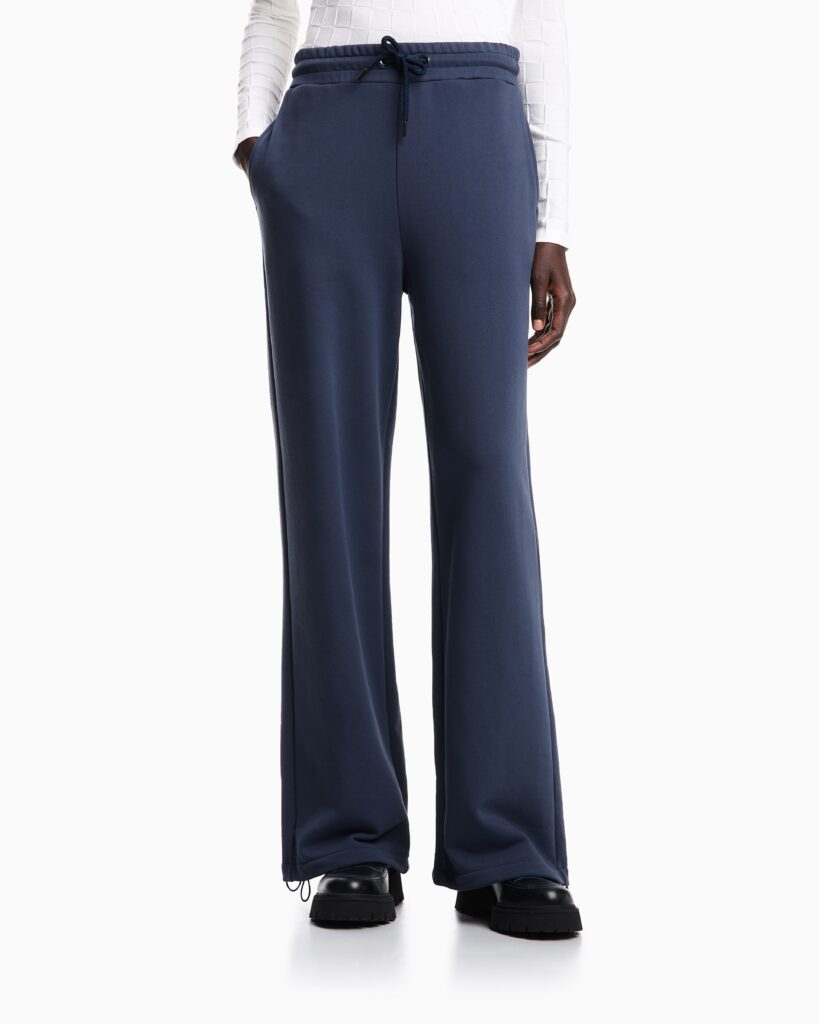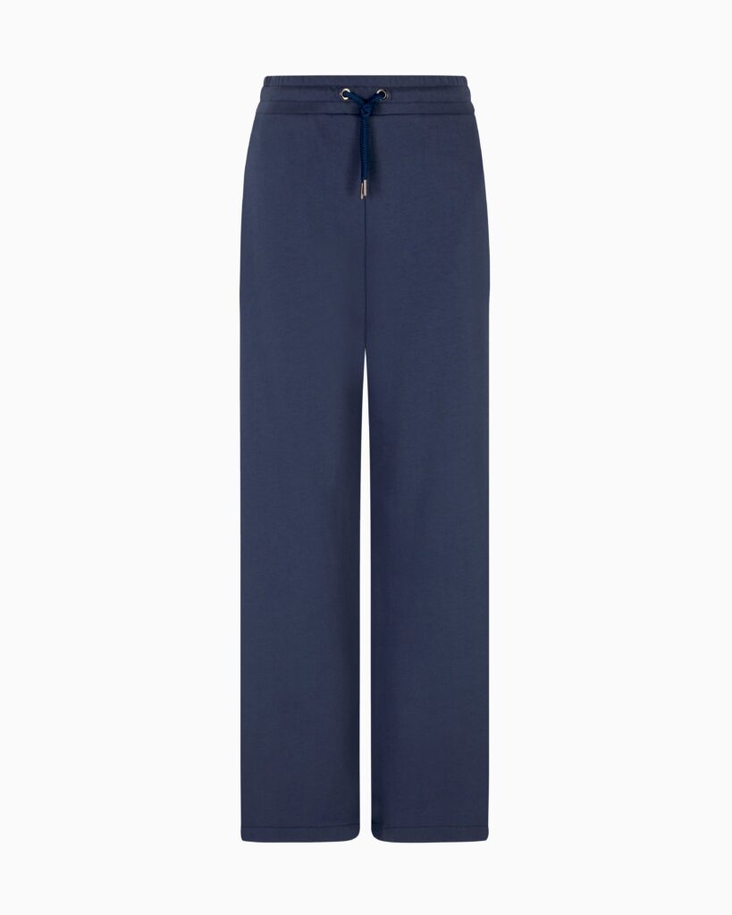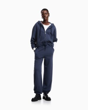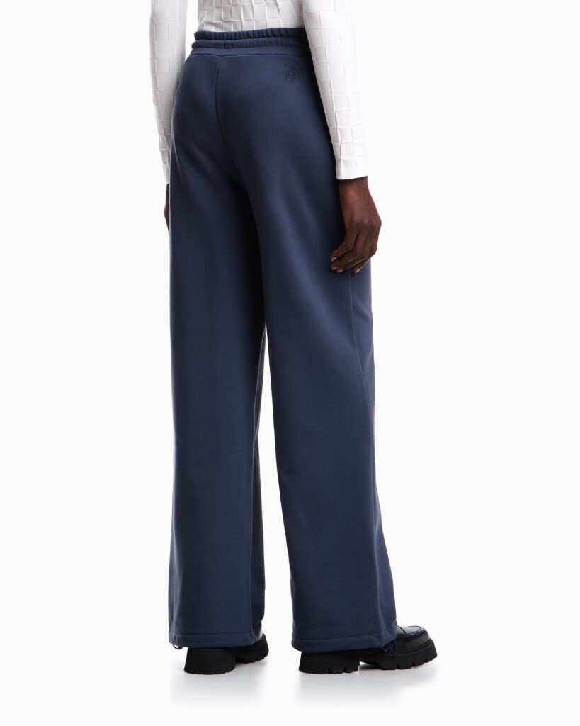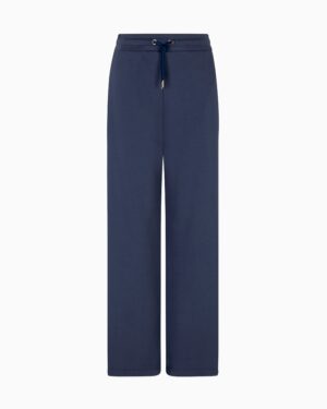 Itāļu luksusa zīmola Emporio Armani tumši pelēkzilas sportiskā stila bikses ar elastīgu, sasienamu jostasvietu. Izgatavotas no blīva un mīksta kokvilnas materiāla ar frotē iekšpusi. Papildinātas ar savelkamām apakšmalām un izsmalcinātu zīmola monogrammas izšuvumu mugurpusē.