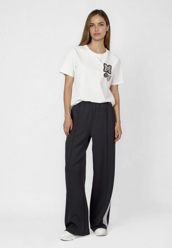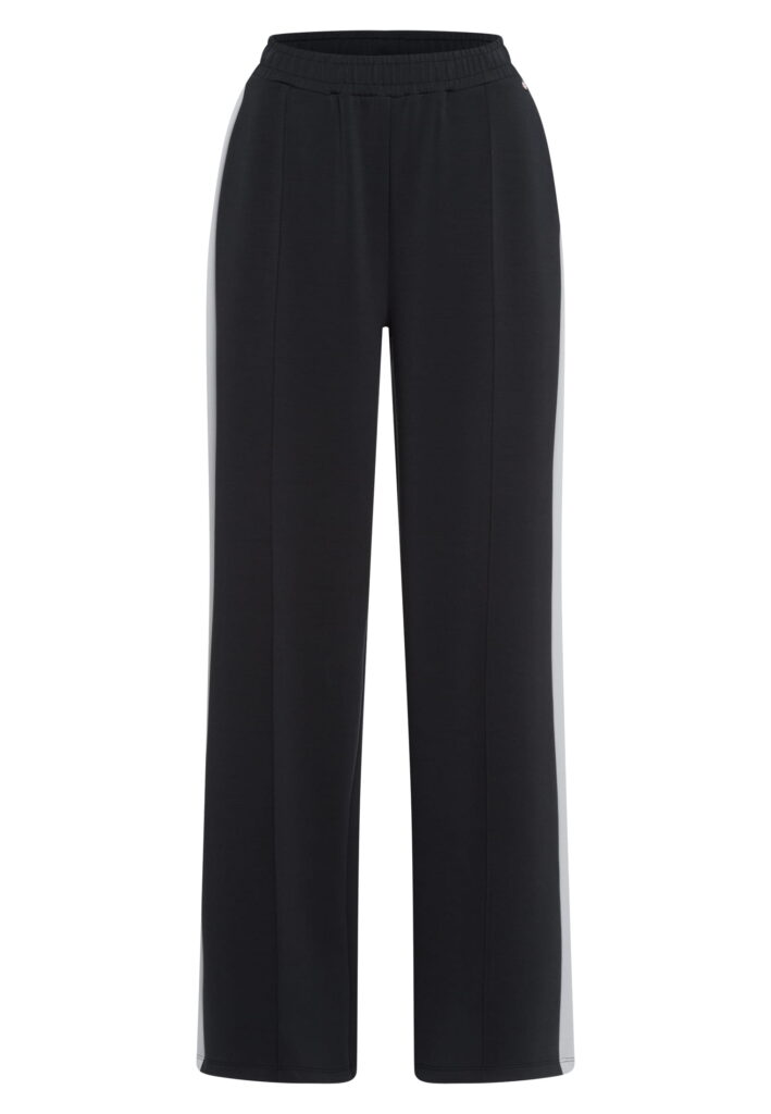 Vācu modes zīmola Marc Aurel zilganmelnas sportiskā stila sieviešu bikses ar elastīgu jostu un vertikālām nošuvēm. Akcentētas ar gaiši pelēku sānu joslu un smalku logo akcentu pie jostas.