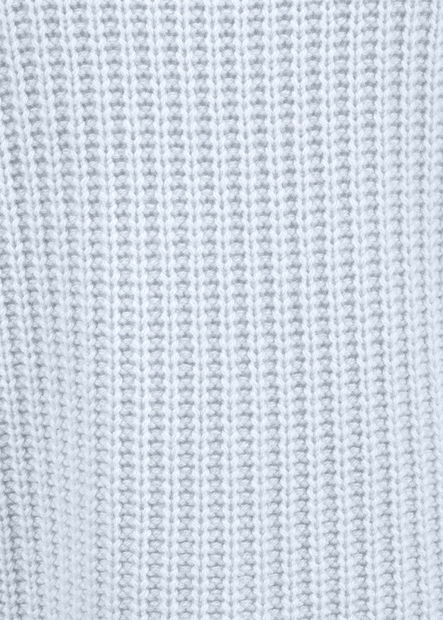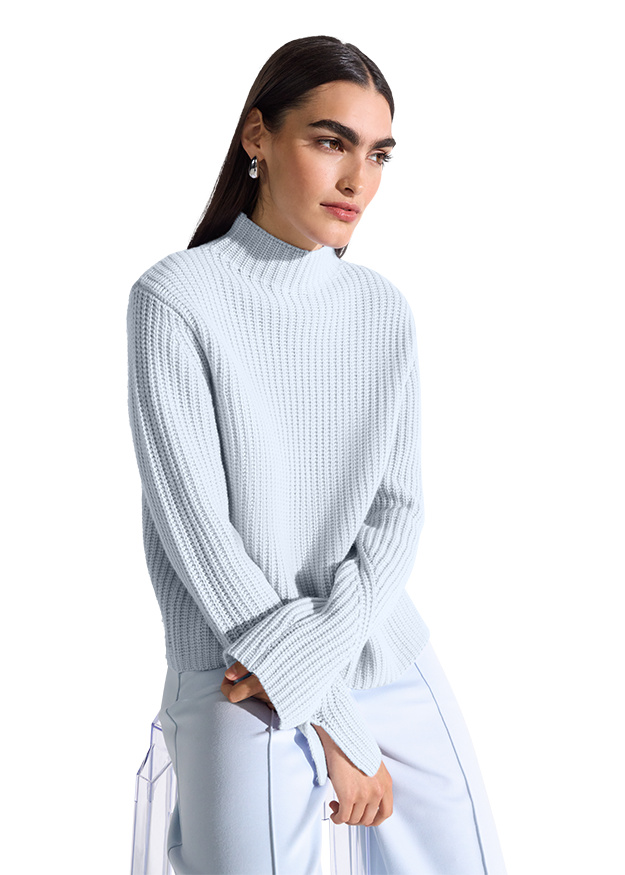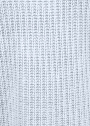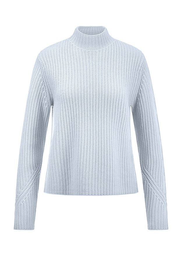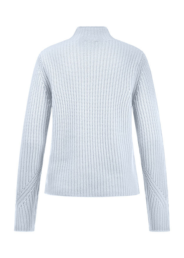 Vācu modes zīmola Riani gaiši pelēkzils rievota adījuma džemperis sievietēm. Izgatavots no siltas un mīkstas vilnas un kašmira dzijas. Papildināts ar paaugstinātu apkakli un šķēlumiem aproču daļā.