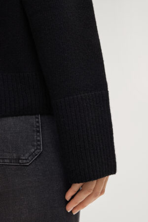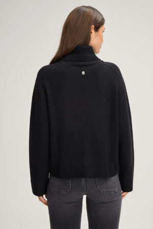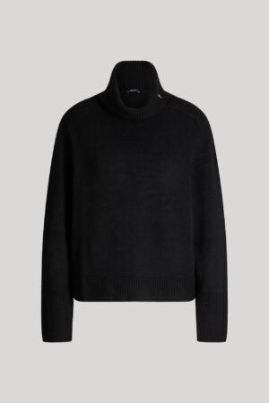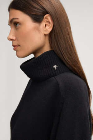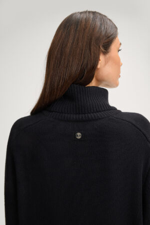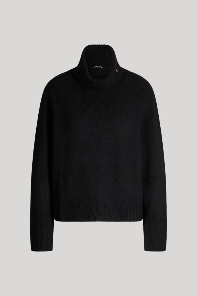 Vācu modes zīmola Joop! adīts sieviešu džemperis ar augstu atlokāmo apkakli melnā krāsā. Izgatavots no biezas viskozes, vilnas un kašmira maisījuma dzijas. Papildināts ar rievotu apdari un smalkiem zīmola logotipa akcentiem.