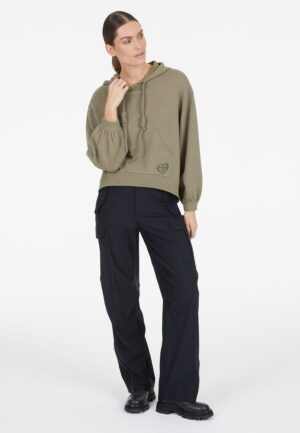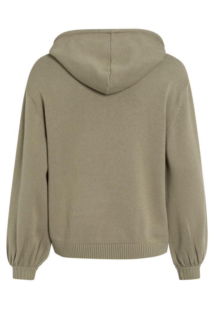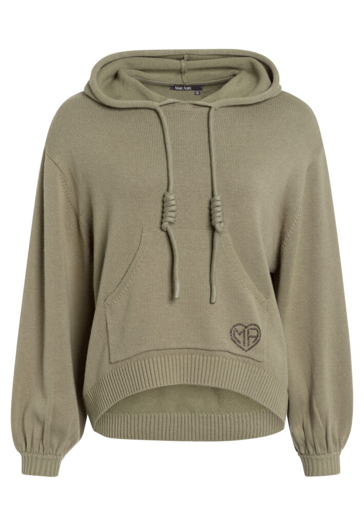 Vācu modes zīmola Marc Aurel adīts brīva piegriezuma sieviešu džemperis dūmakaini sūnu zaļā tonī. Izgatavots no kokvilnas un kašmira maisījuma dzijas. Papildināts ar sasienamu kapuci un rievotu apdari, kā arī mirdzošu zīmola sirdsveida logotipa akcentu uz ķengurkabatas.