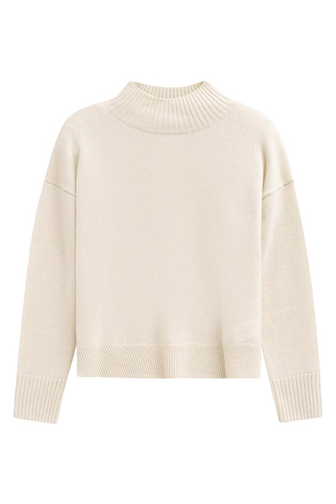 Vācu modes zīmola Bugatti adīts sieviešu džemperis ar augstu apkakli gaišā, krēmīgi bēšā krāsā. Izgatavots no maigas un mīkstas kašmira dzijas. Papildināts ar rievotu apdari un sānu šķēlumiem, kā arī askētisku zīmola logotipa akcentu apakšmalā.