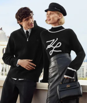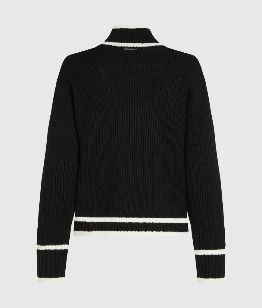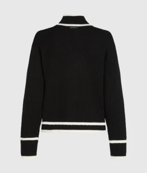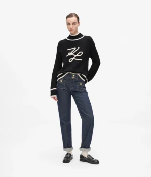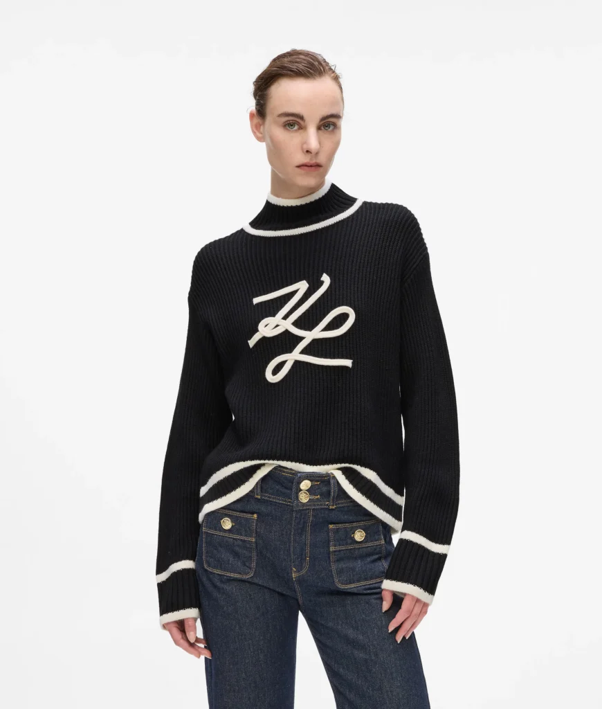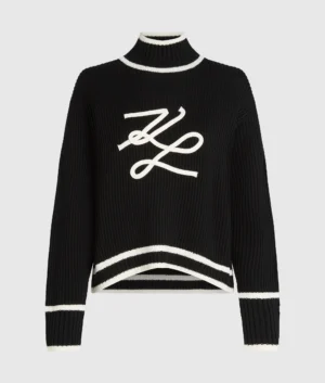 Vācu luksusa zīmola Karl Lagerfeld melns rievota adījuma sieviešu džemperis ar paaugstinātu apkakli, kontrastējošu svītru apdari un zīmola autogrāfa dekoru. Papildināts ar smalku logotipa plāksnīti mugurpusē.