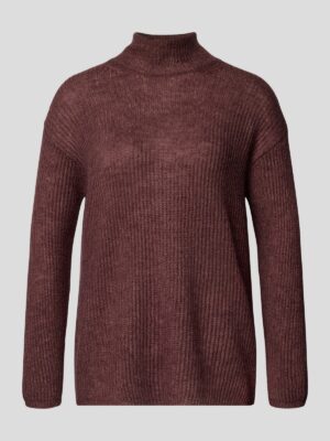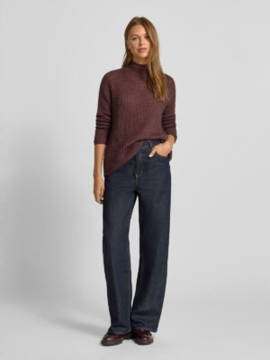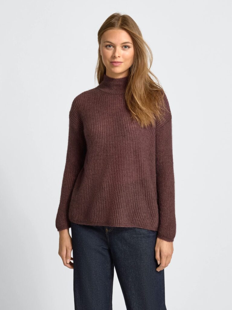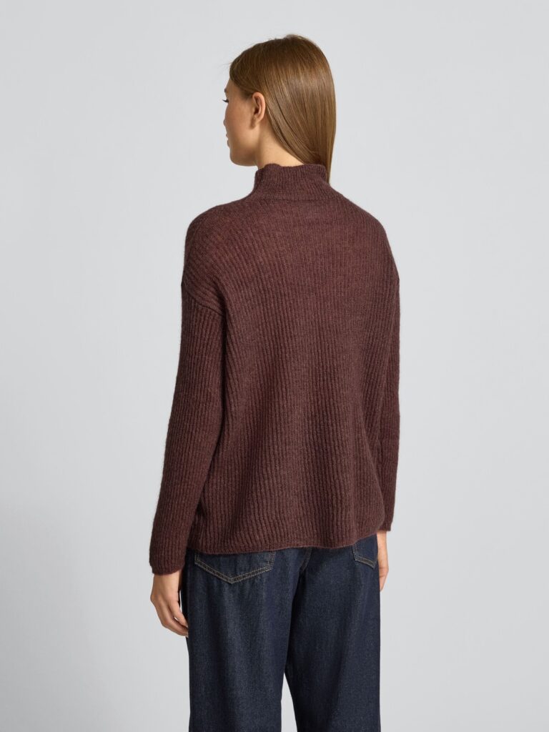 Itāļu modes zīmola MM by Max Mara sieviešu džemperis violeti brūnā krāsā. Izgatavots no mohēras un vilnas maisījuma dzijas rievota adījuma rakstā. Papildināts ar augstu, smalki rievotu apkakli.
