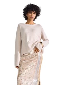 Vācu zīmola UNQ silts un mīksts sieviešu džemperis ar grafisku rakstu gaiši bēšā un melnā krāsā. Papildināts ar paaugstinātu apkakli.