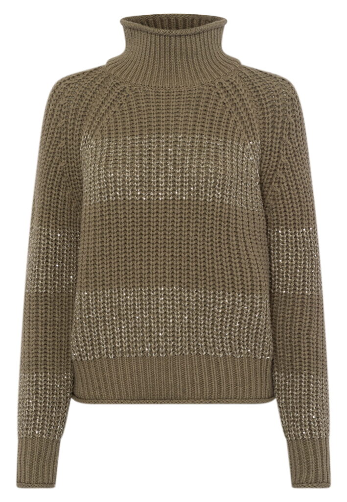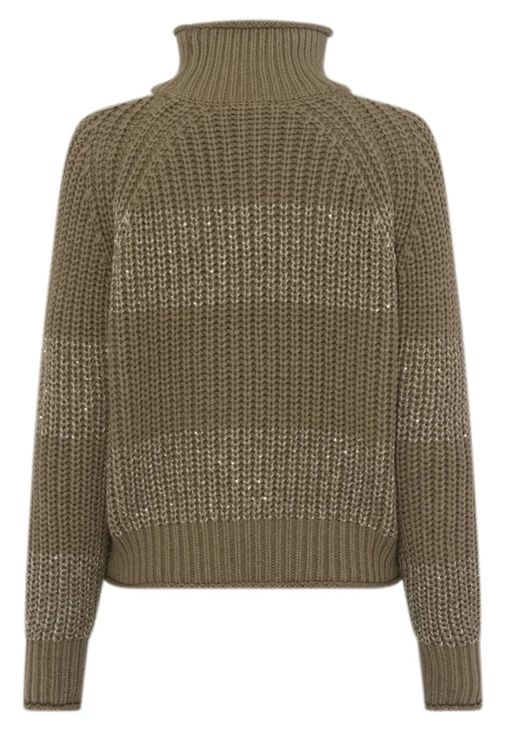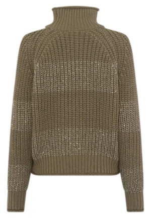 Vācu modes zīmola Marc Aurel adīts sieviešu džemperis ar augstu apkakli dūmakaini sūnu zaļā tonī. Izgatavots no biezas kokvilnas maisījuma dzijas rievota adījuma rakstā. Akcentēts ar viegli midzošām smalku fliteru apdares horizontālajām joslām.