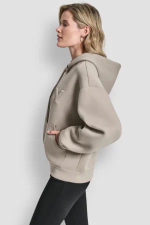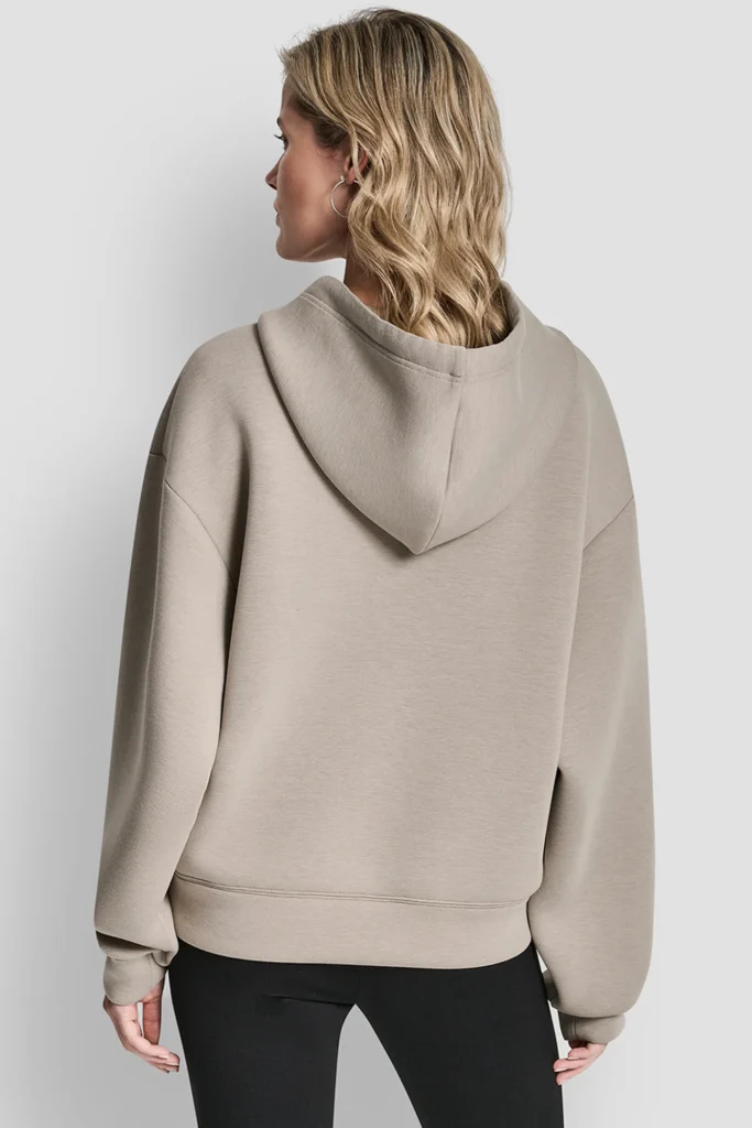 ASV modes zīmola DKNY sportiskā stila sieviešu džemperis ar sasienamu kapuci gaiši pelēkbrūnā krāsā. Izgatavots no mīksta un elastīga scuba materiāla. Papildināts ar ķengurkabatu un reljefu 3D logo akcentu.