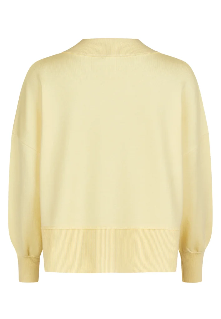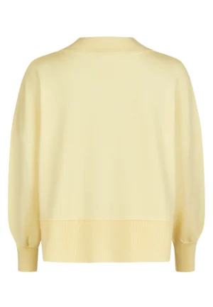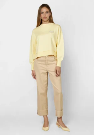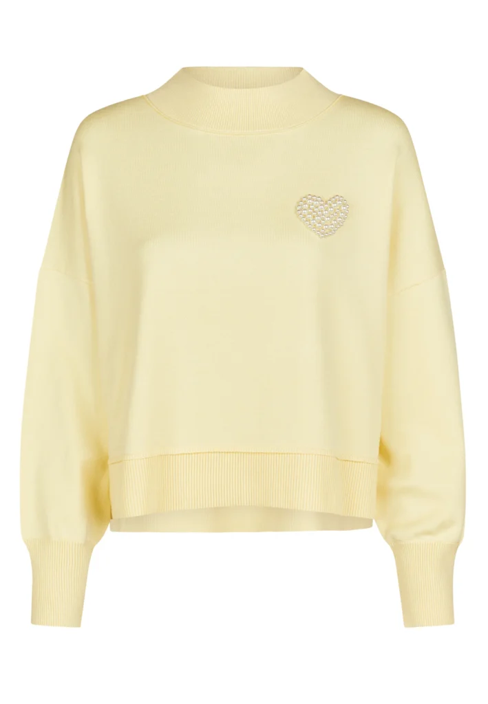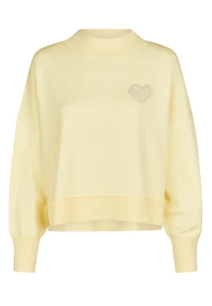 Vācu modes zīmola Marc Aurel gaiši dzeltens sieviešu sportiskā stila džemperis ar pērlītēm izšūtu sirds formas emblēmu. Izgatavots no mīksta viskozes maisījuma materiāla. Papildināts ar platu, smalki rievotu apdari, sānu šķēlumiem un mugurpusē pagarinātu apakšmalu.