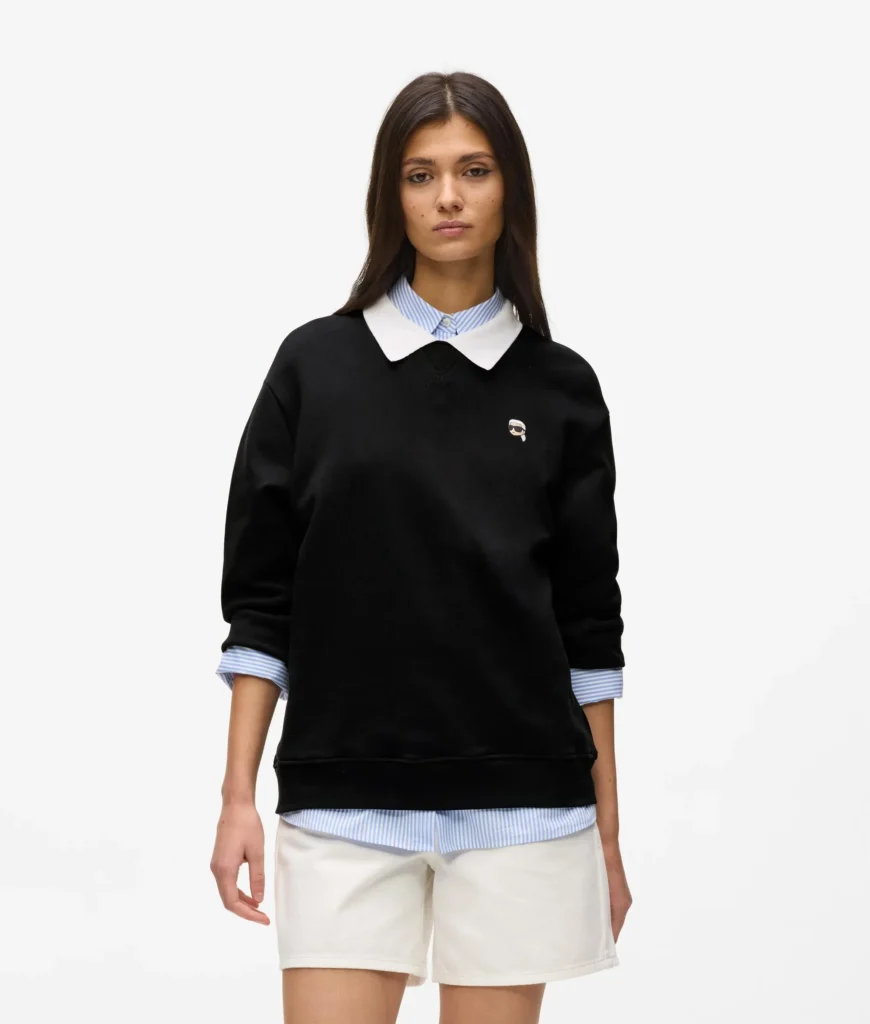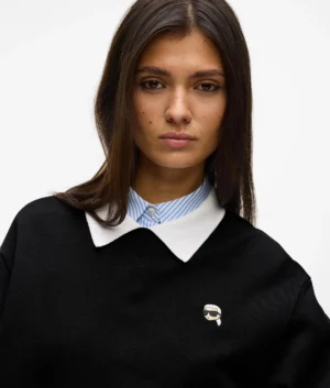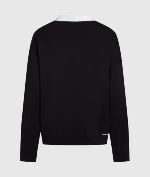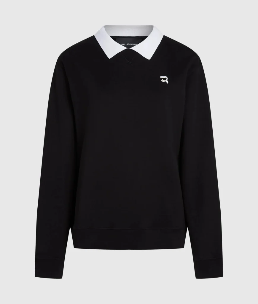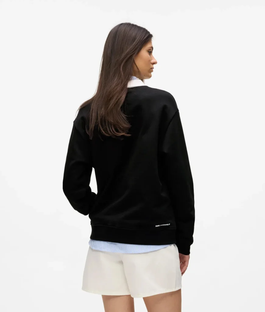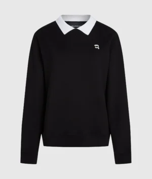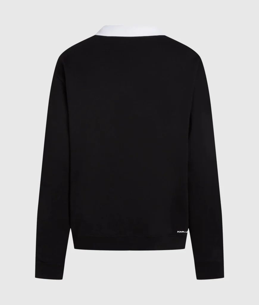 Vācu luksusa zīmola Karl Lagerfeld melns sieviešu sportiskā stila džemperis ar kontrastējošu kreklveida apkakli. Izgatavots no augstākās kvalitātes organiskās kokvilnas. Papildināts ar ikonisko Karl emblēmas akcentu un zīmola logotipa izšuvumu apakšmalā.