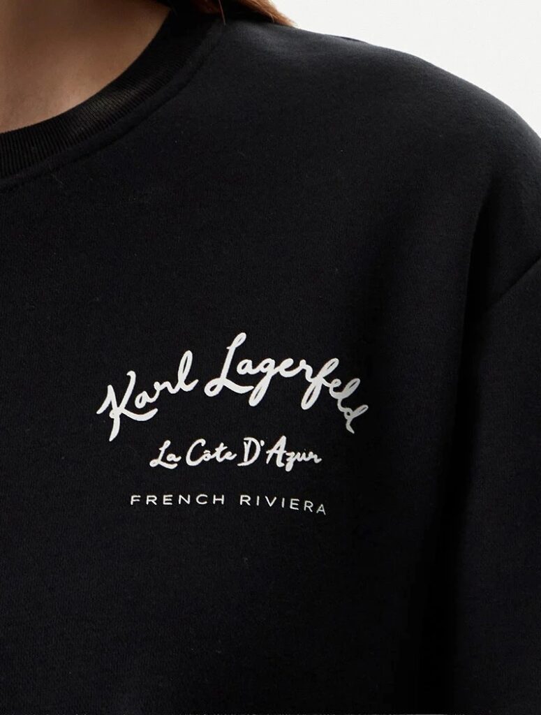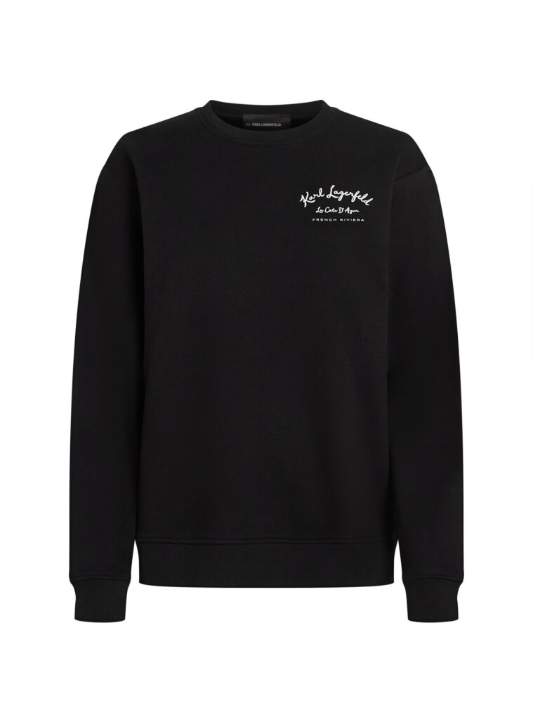 Vācu luksusa zīmola Karl Lagerfeld sieviešu sportiskā stila džemperis melnā krāsā. Izgatavots no blīva organiskās kokvilnas materiāla. Papildināts ar Côte D’Azur uzraksta akcentu un kontrastējošām zīmola logotipa detaļām.