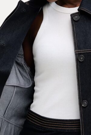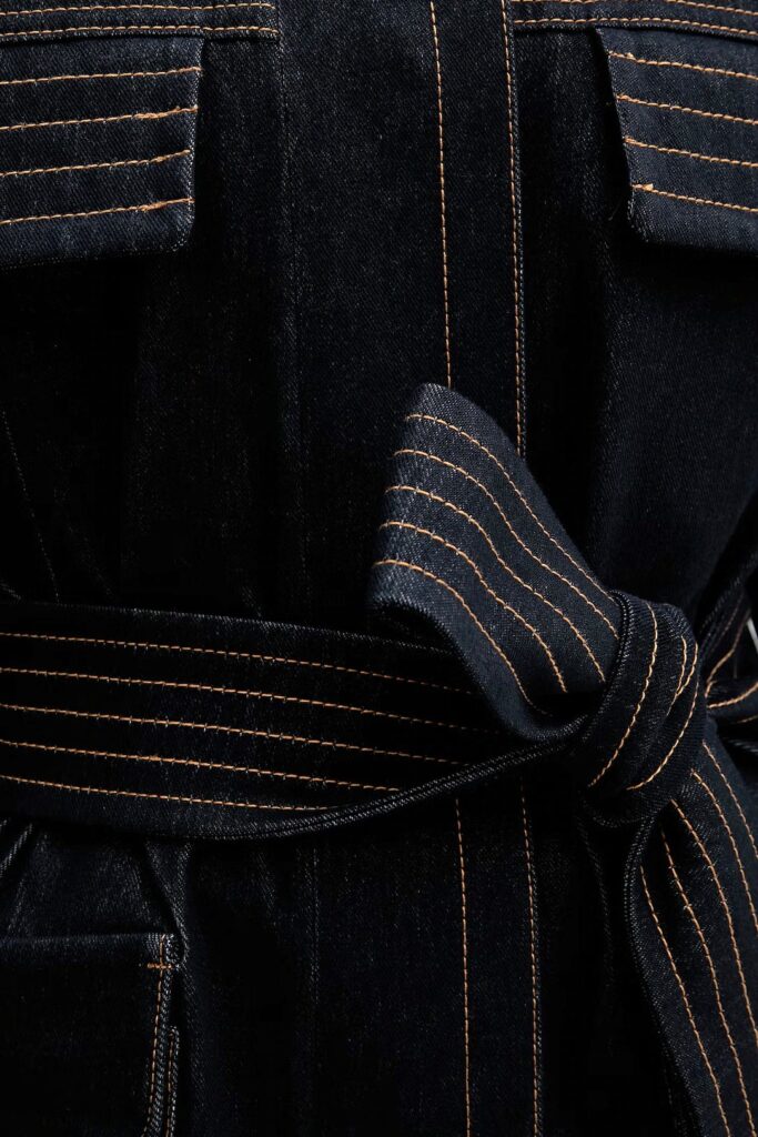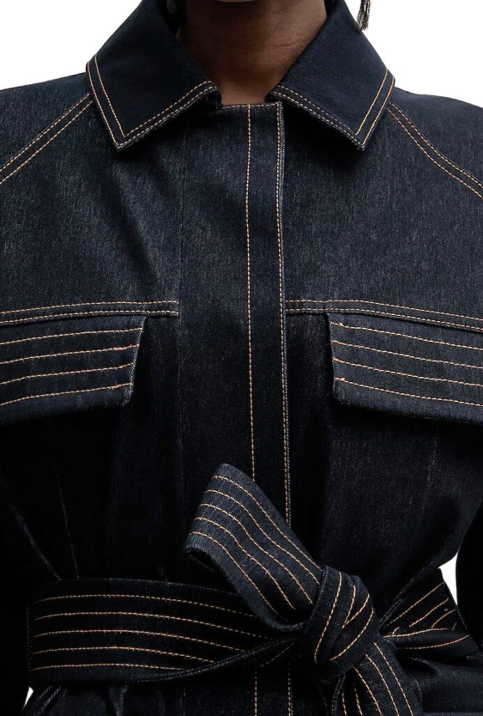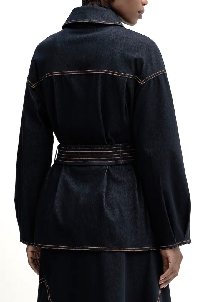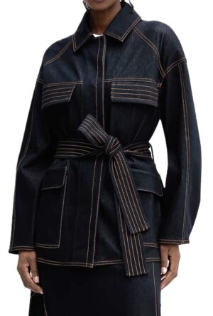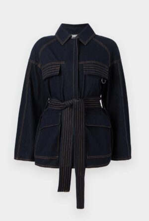 Itāļu modes zīmola MM by Max Mara tumši zila sieviešu jaka ar slēptu pogu aizdari un sasienamu jostu. Izgatavota no blīva un elastīga kokvilnas maisījuma materiāla ar džinsveida struktūru. Papildināta ar atloku kabatām un ielocēm aproču daļā. Akcentēta ar kontrastējošām dekoratīvajām nošuvēm.