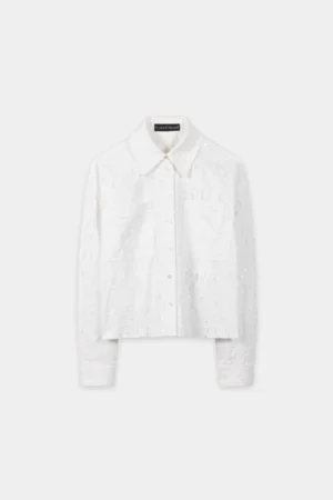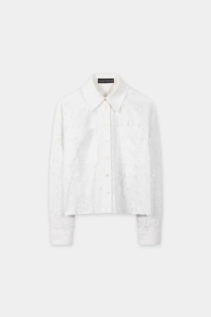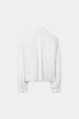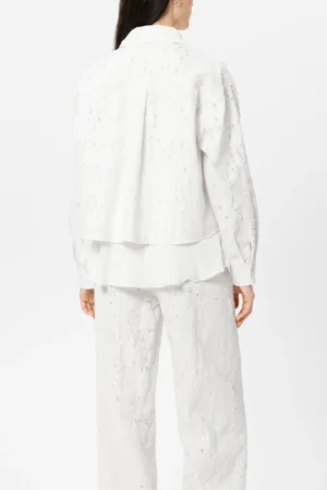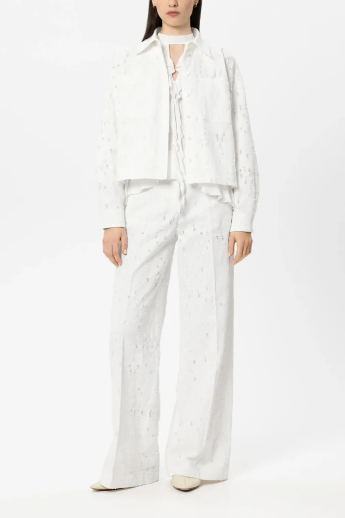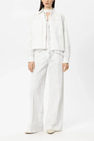 Vācu premium klases apģērbu zīmola Luisa Cerano balta saīsināta piegriezuma sieviešu jaka ar smalku plēsumu detaļām. Izgatavota no 100% kokvilnas materiāla ar džinsveida struktūru. Papildināta ar neapstrādāta stila apakšmalu, uzšūtām krūšu kabatām un ielocēm mugurpusē. Akcentēta ar balti zaigojošu fliteru izšuvumiem.