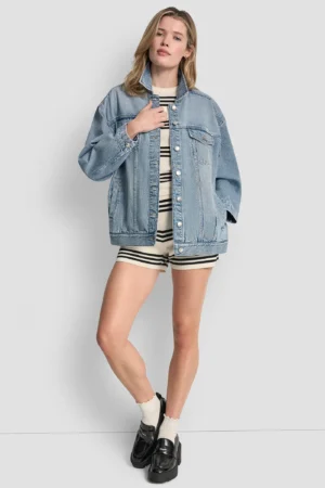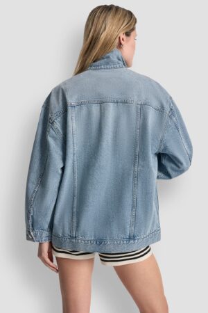 Moderna klasiskās džinsu jakas versija ar pagarinātu siluetu un nolaistu plecu daļu – stilīgai ikdienai un apģērbu slāņošanai.