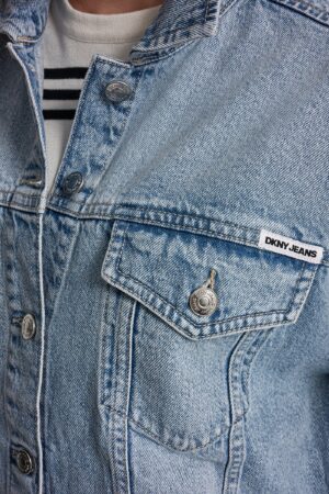 ASV modes zīmola DKNY sieviešu džinsu jaka zilā krāsā ar izbalojuma efektu. Izgatavota no 100% kokvilnas. Papildināta ar kabatām, dekoratīvām nošuvēm, kā arī zīmola logotipa akcentiem un detaļām.
