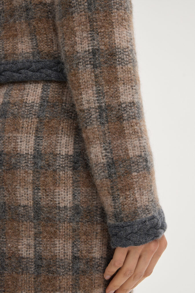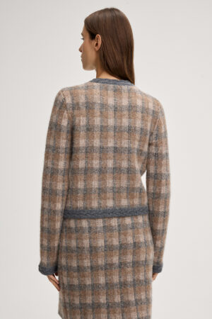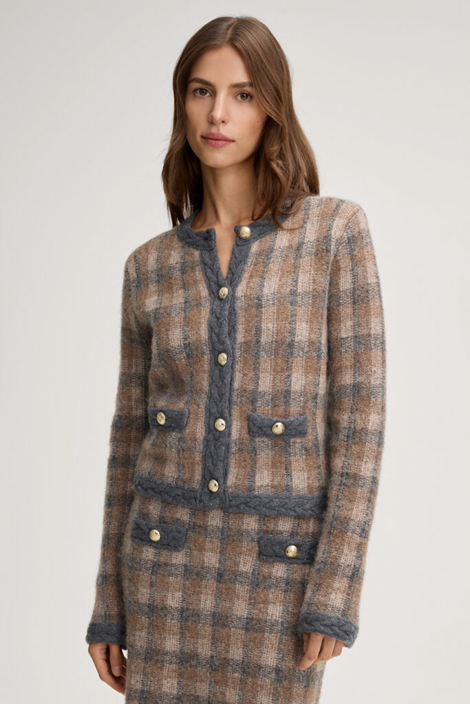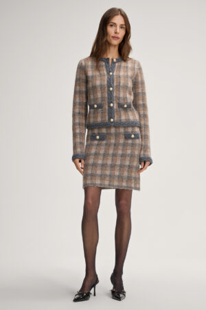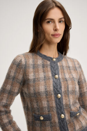 Vācu modes zīmola Joop! sieviešu jaka ar rūtotu rakstu pelēcīgi brūnos toņos. Izgatavota no bieza vilnas un alpakas maisījuma materiāla. Akcentēta ar dekoratīvām kabatām, pelēku pīņu adījuma apdari un greznu zīmola dizaina zelta krāsas pogu aizdari.