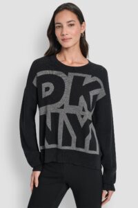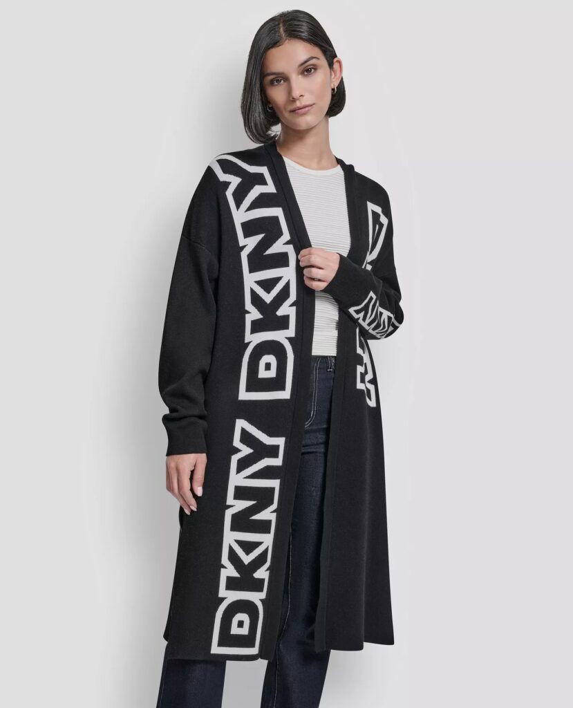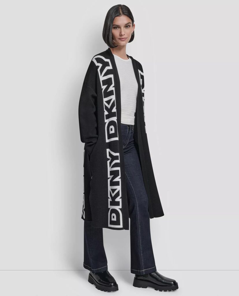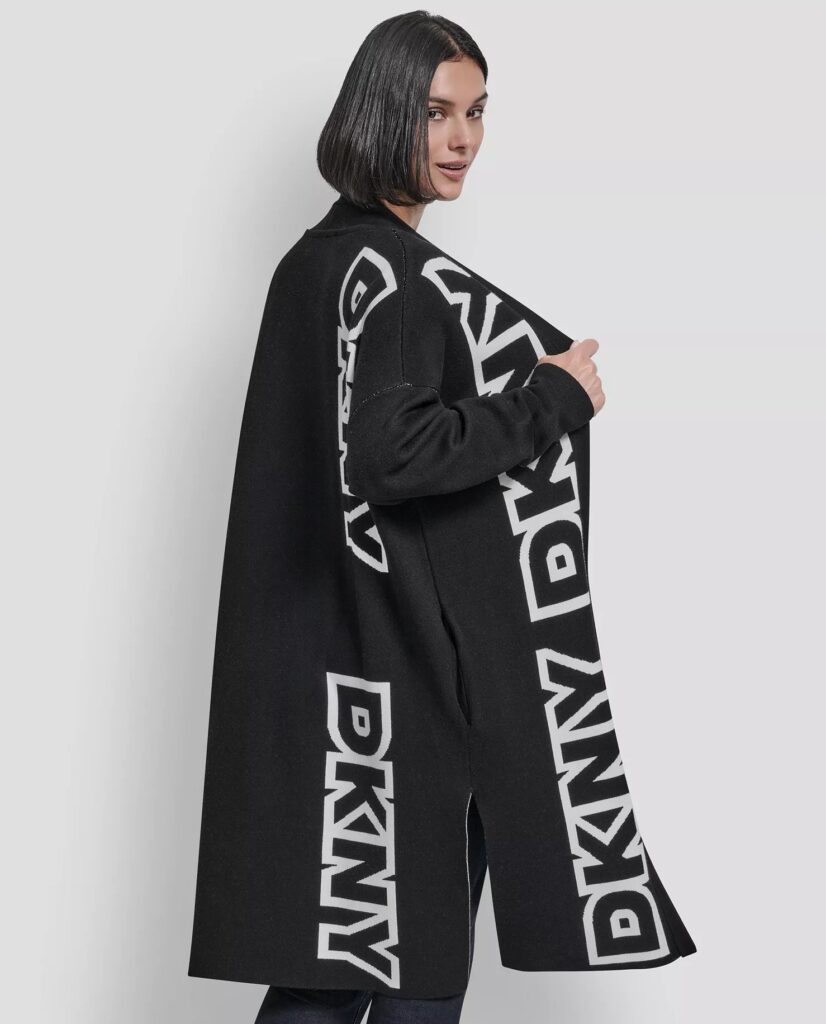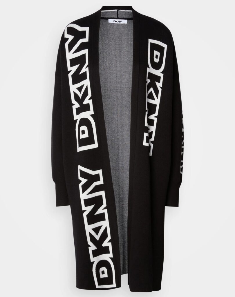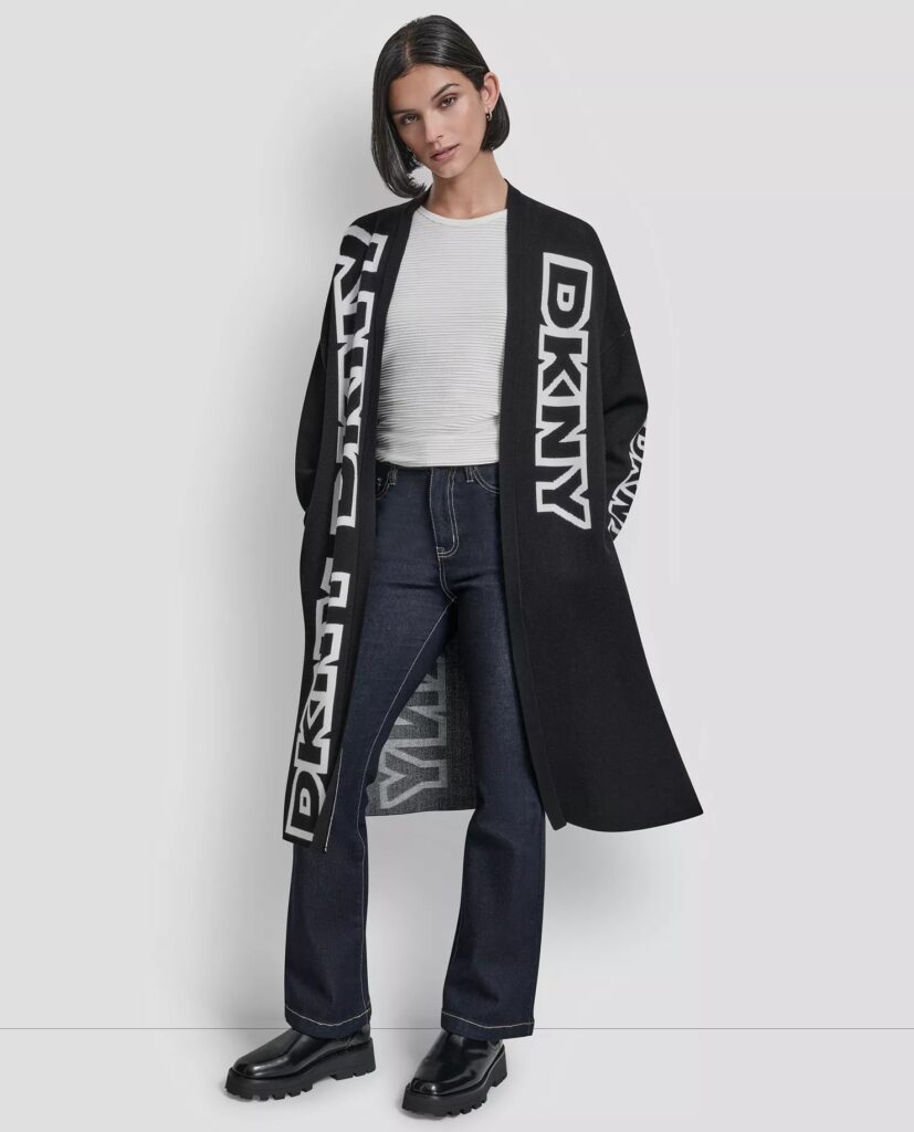 ASV modes zīmola DKNY melna brīva silueta mēteļveida jaka ar sānu šķēlumiem. Izgatavota no blīva un bieza viskozes maisījuma materiāla. Papildināta ar vertikāliem lielizmēra logotipa akcentiem.