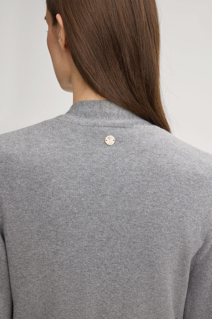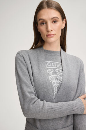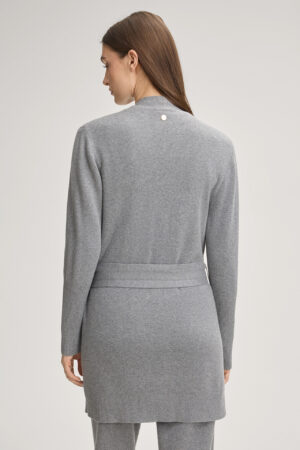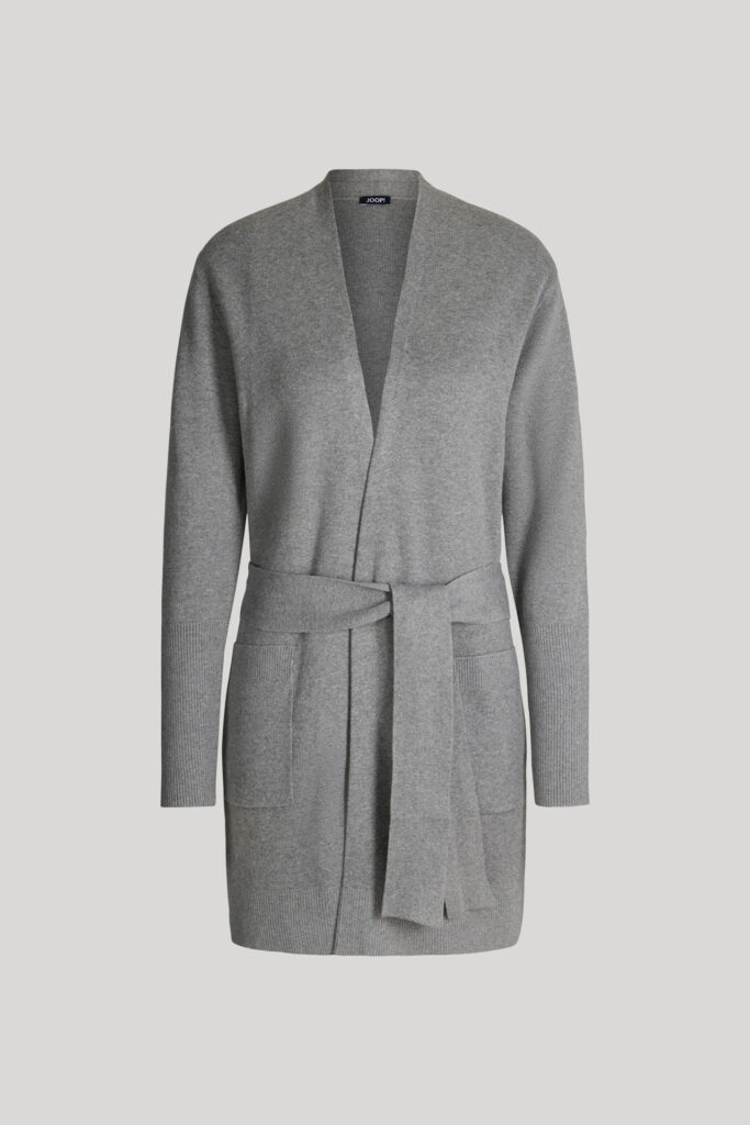 Vācu modes zīmola Joop! pelēka pagarināta silueta sieviešu jaka ar sasienamas jostas aizdari. Izgatavota no kokvilnas un zīda maisījuma dzijas. Papildināta ar uzšūtām kabatām un smalki rievotu apdari, kā arī ikonisko zīmola logotipa akcentu mugurpusē.