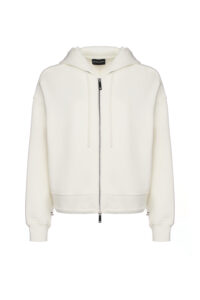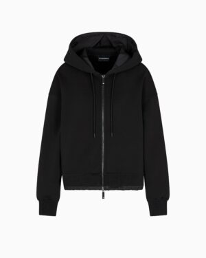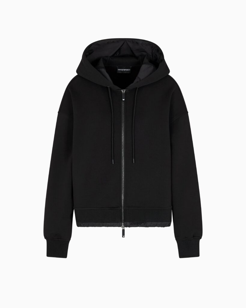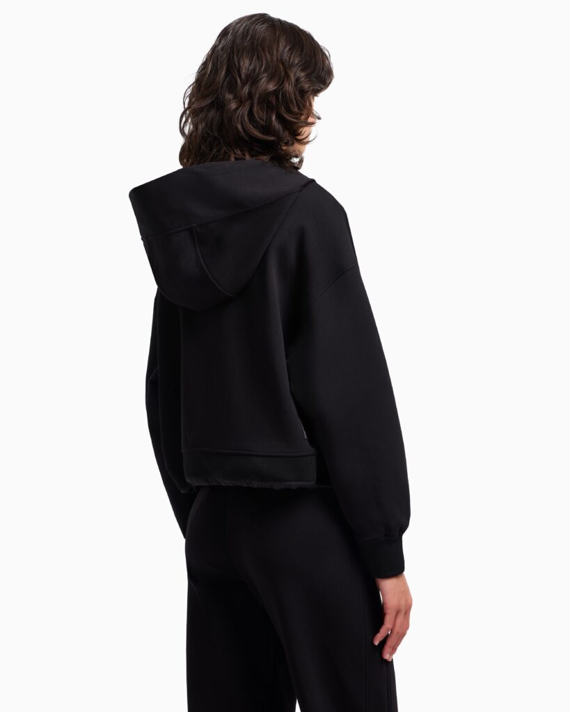 Itāļu luksusa zīmola Emporio Armani melna sieviešu sportiskā stila jaka ar sasienamu kapuci no Travel Essentials kapsulkolekcijas. Izgatavota no blīva un mīksta džersija auduma ar neilona apdari. Papildināta ar divvirziena rāvējslēdzēja aizdari, savelkamu apakšmalu un izsmalcinātiem zīmola logotipa akcentiem.