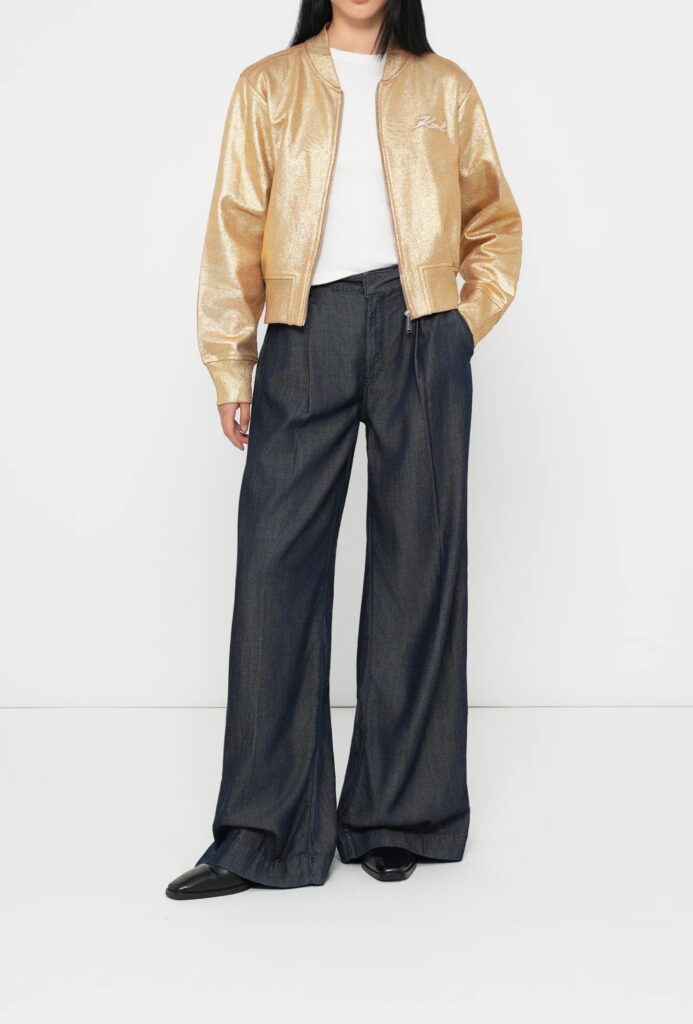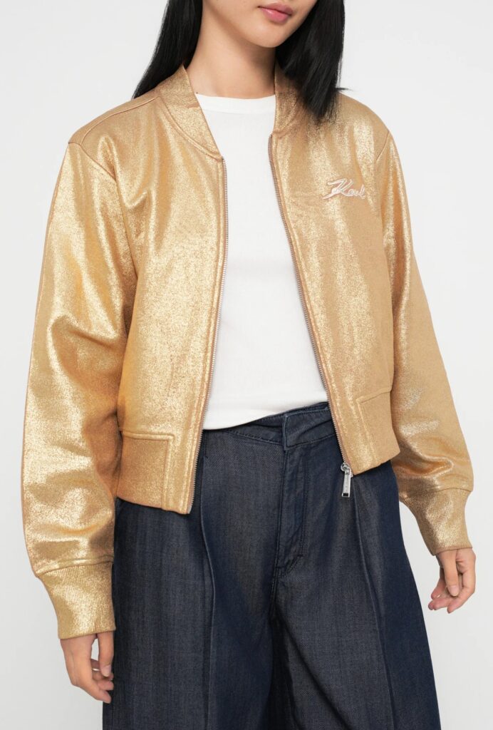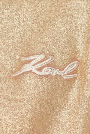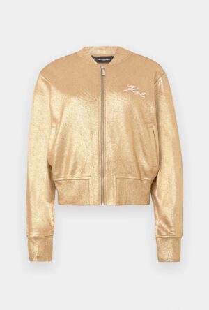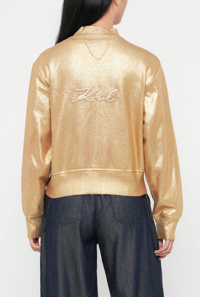 Vācu luksusa zīmola Karl Lagerfeld bēša sieviešu sportiskā stila jaka ar zelta krāsas pārklājumu. Izgatavota no 100% organiskās kokvilnas. Papildināta ar elastīgu apdari un zīmola paraksta 3D izšuvumiem.