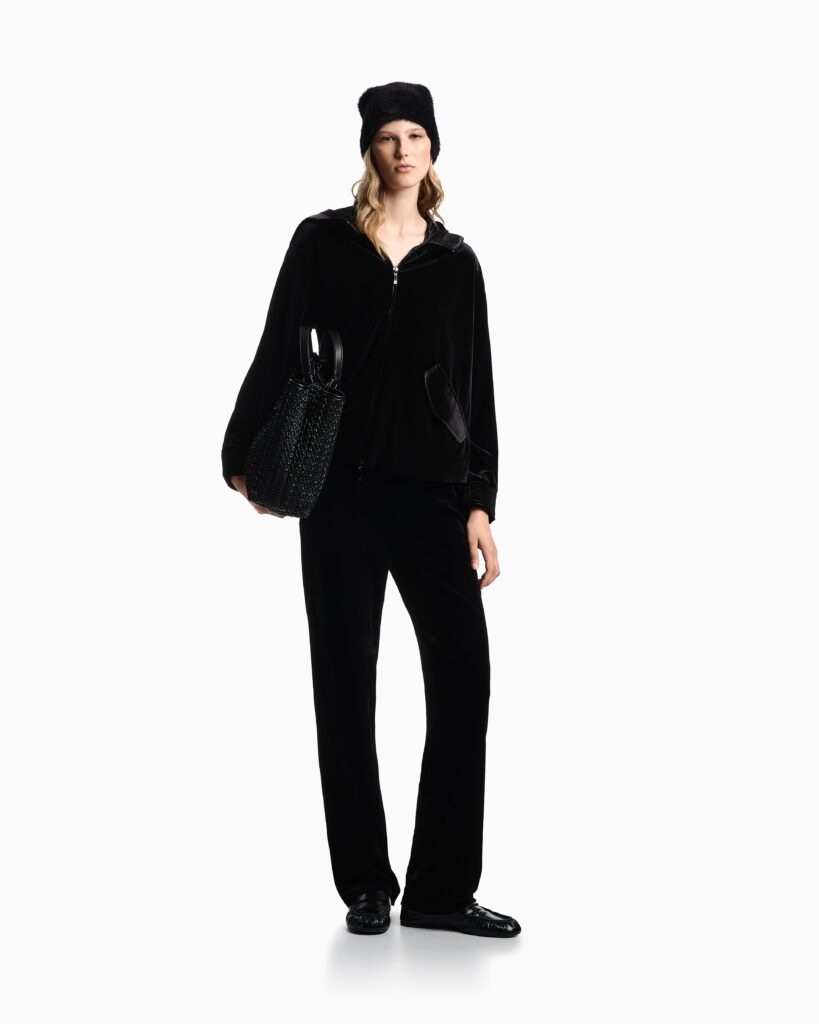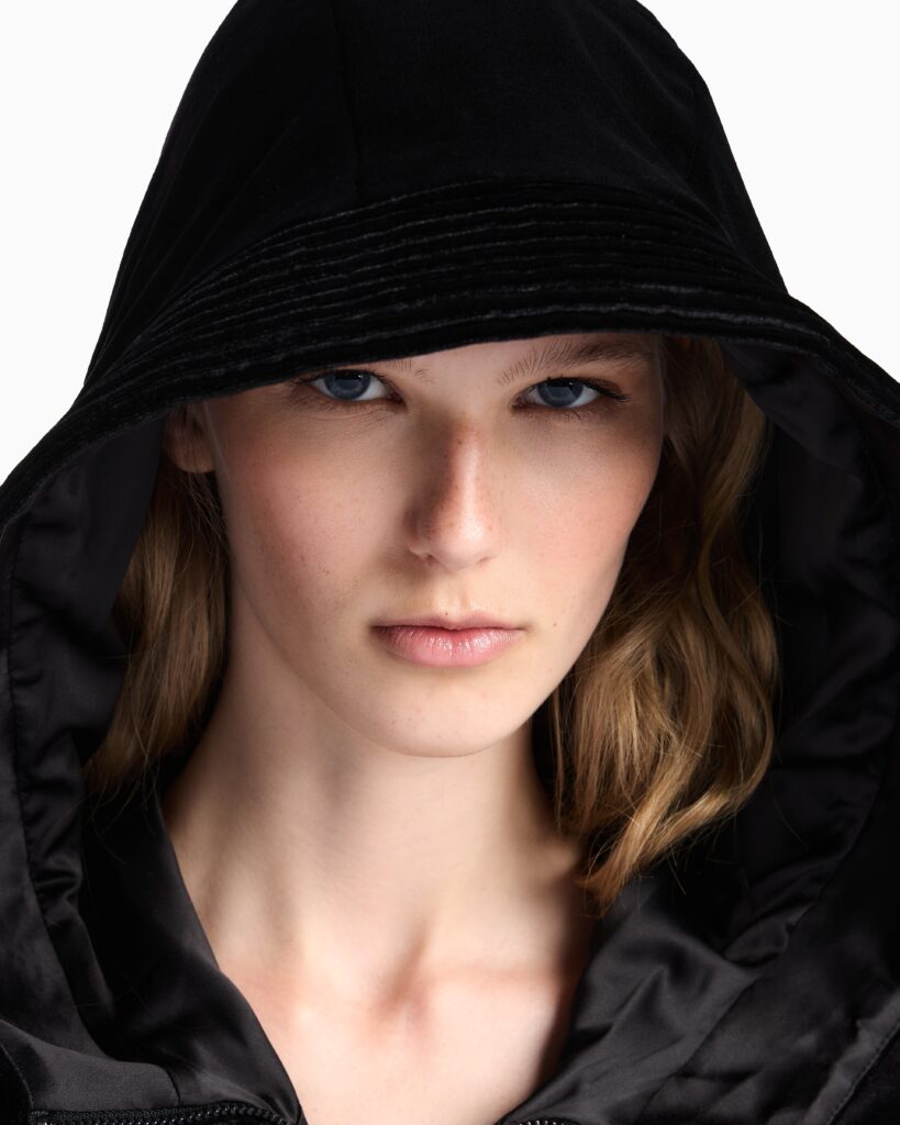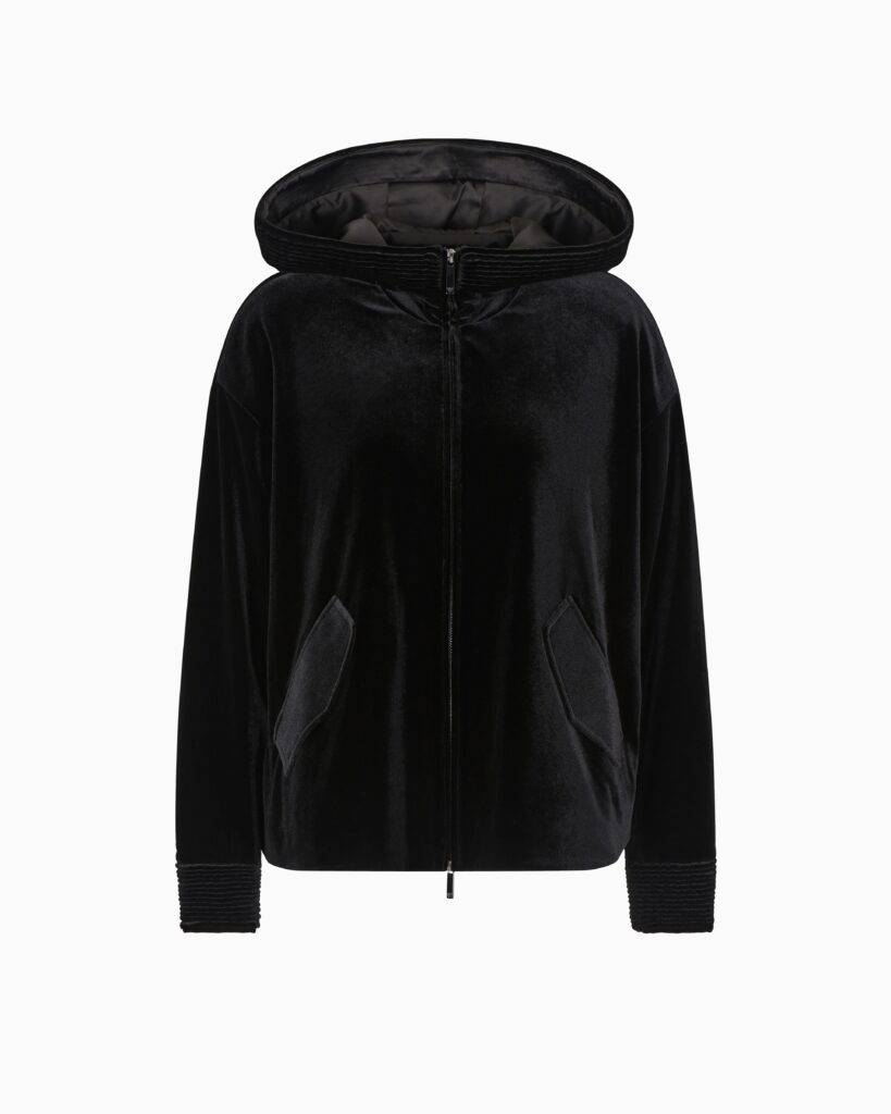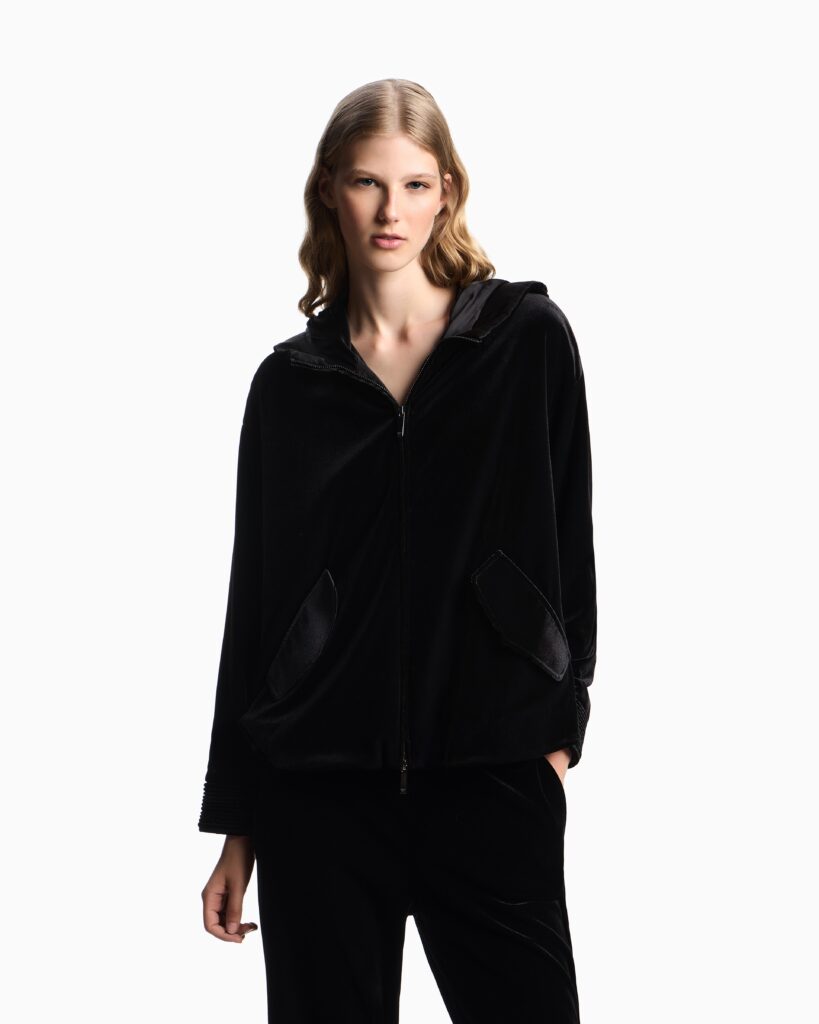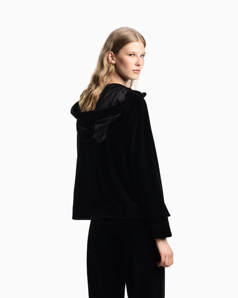 Itāļu luksusa zīmola Emporio Armani melna sieviešu jaka ar kapuci un divvirziena rāvējslēdzēja aizdari. Izgatavota no elastīga un samtaina šenila auduma. Papildināta ar satīna oderi, kā arī smalki krokotu aproču un kapuces apdari.