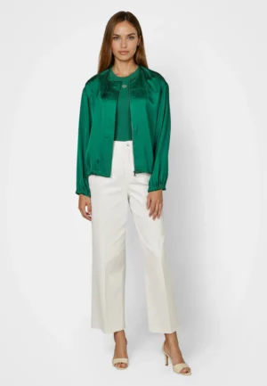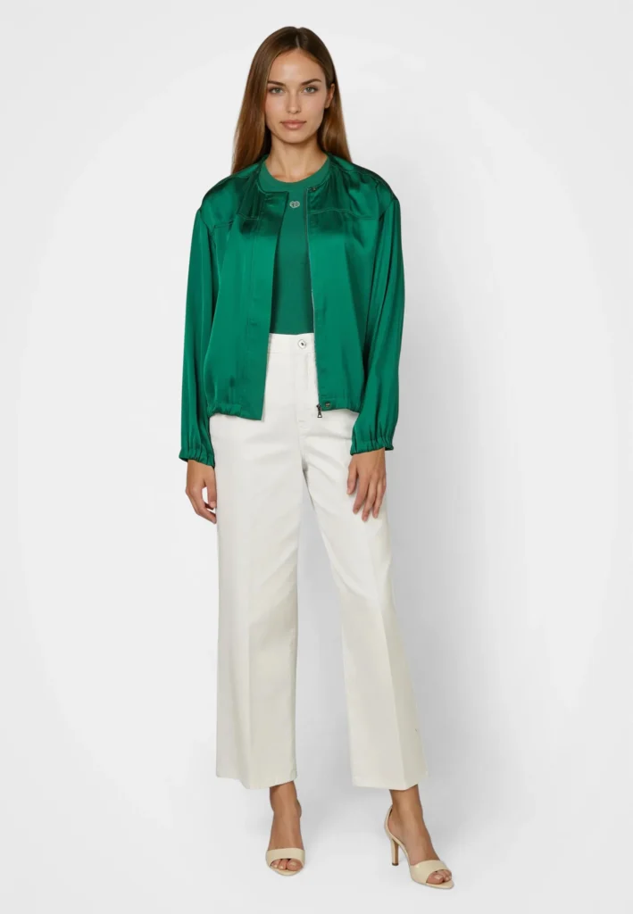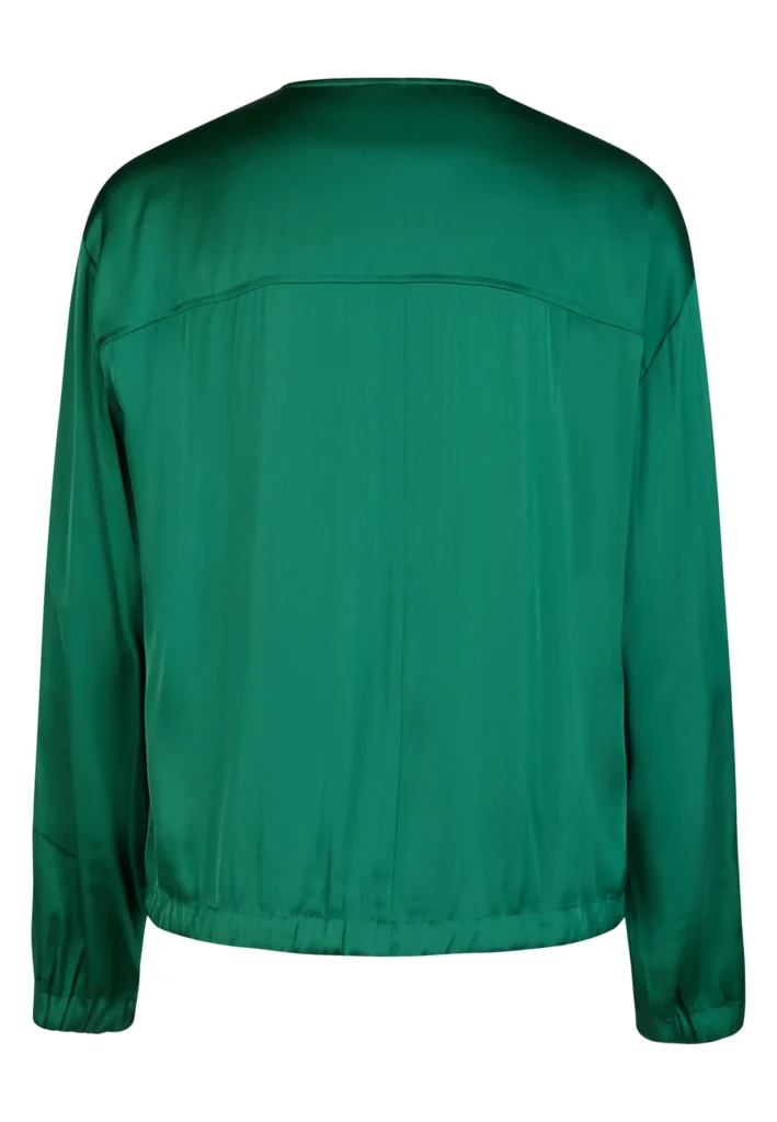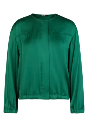 Vācu modes zīmola Marc Aurel koši zaļs sieviešu bluzons ar slēptu rāvējslēdzēja aizdari. Izgatavots no plūstoša viskozes maisījuma materiāla ar satīna spīdumu. Papildināts ar elastīgu aproču un apakšmalas apdari, kā arī iešūtām sānu kabatām.