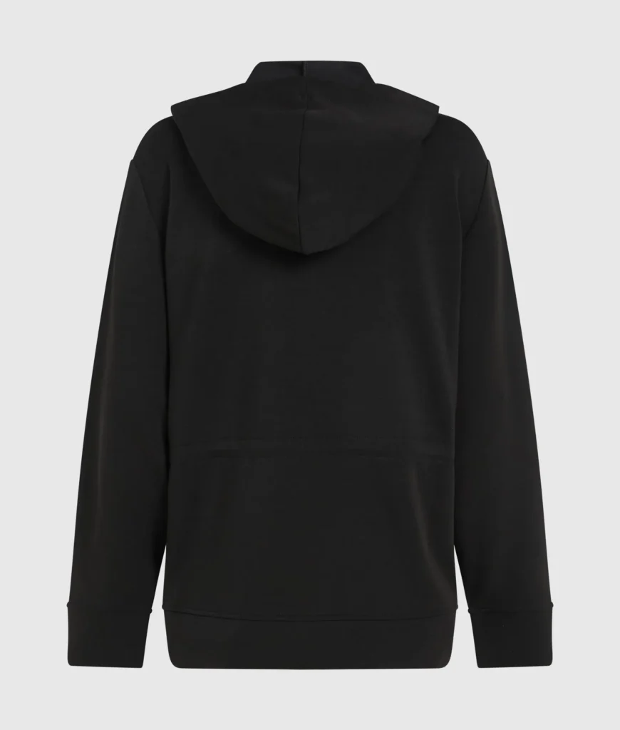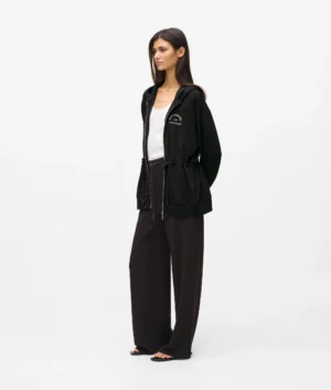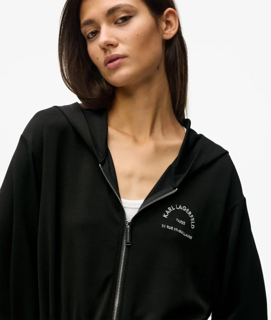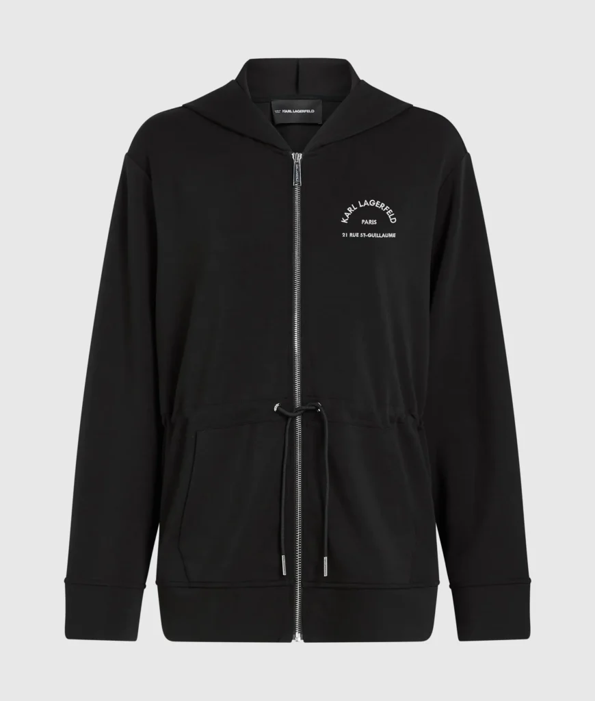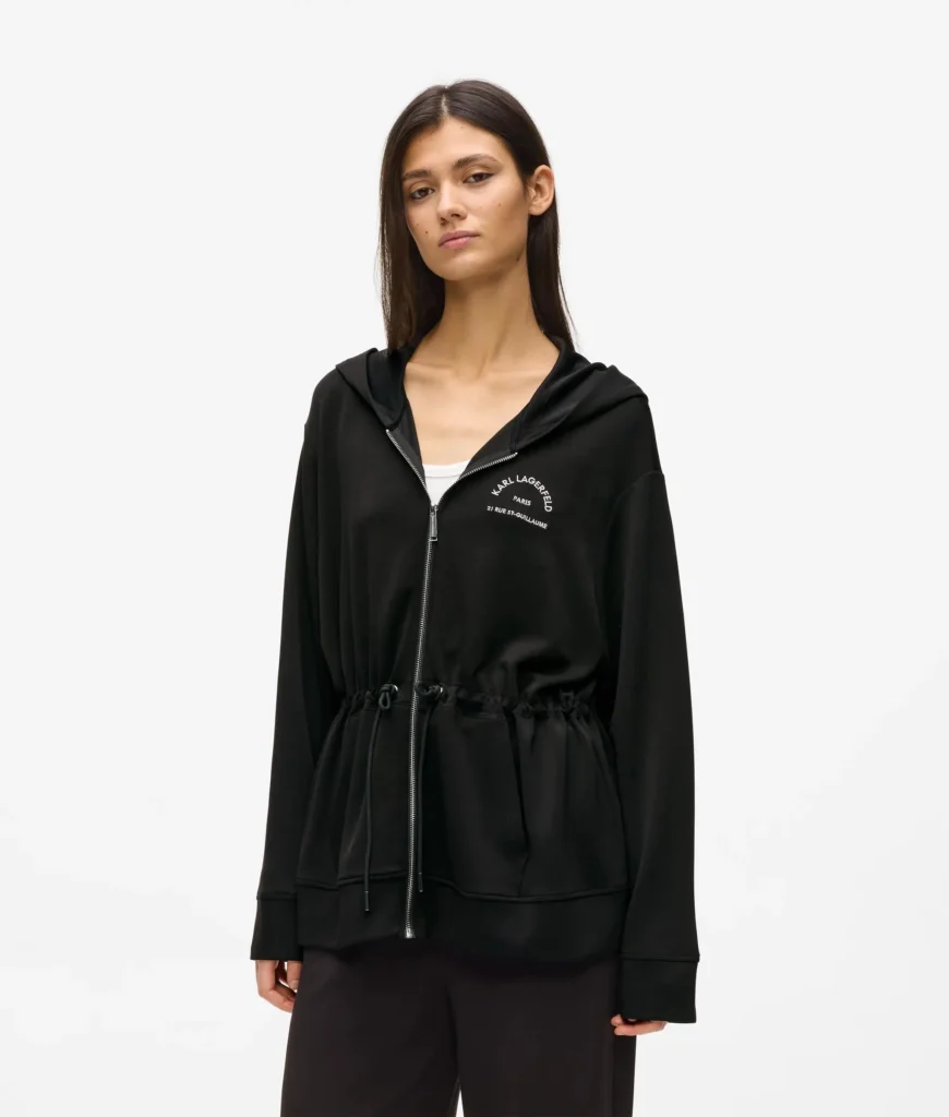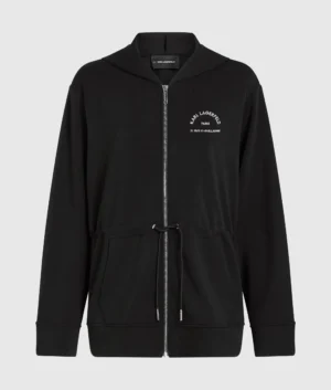 Vācu luksusa zīmola Karl Lagerfeld melna eleganta silueta sieviešu jaka ar kapuci un sasienamu jostasvietu. Izgatavota no blīva un elastīga viskozes maisījuma materiāla. Akcentēta ar sudraba krāsas metāla detaļām un kontrastējošu zīmola adreses ikoniskā logotipa izšuvumu.
