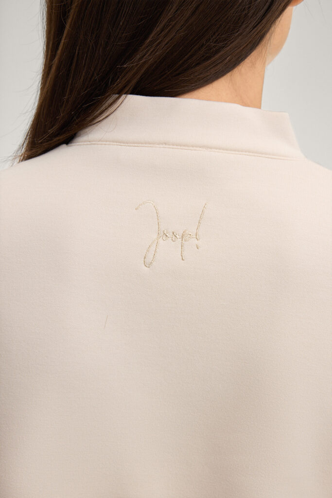 Vācu modes zīmola Joop! krēmīgi bēša sportiskā stila sieviešu jaka ar paaugstinātu koledžas stila apkakli. Izgatavota no mīlsta un elastīga modāla maisījuma materiāla. Akcentēta ar zelta krāsas zīmola spiedpogu aizdari un smalku logo izšuvumu pie apkakles mugurpusē.