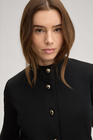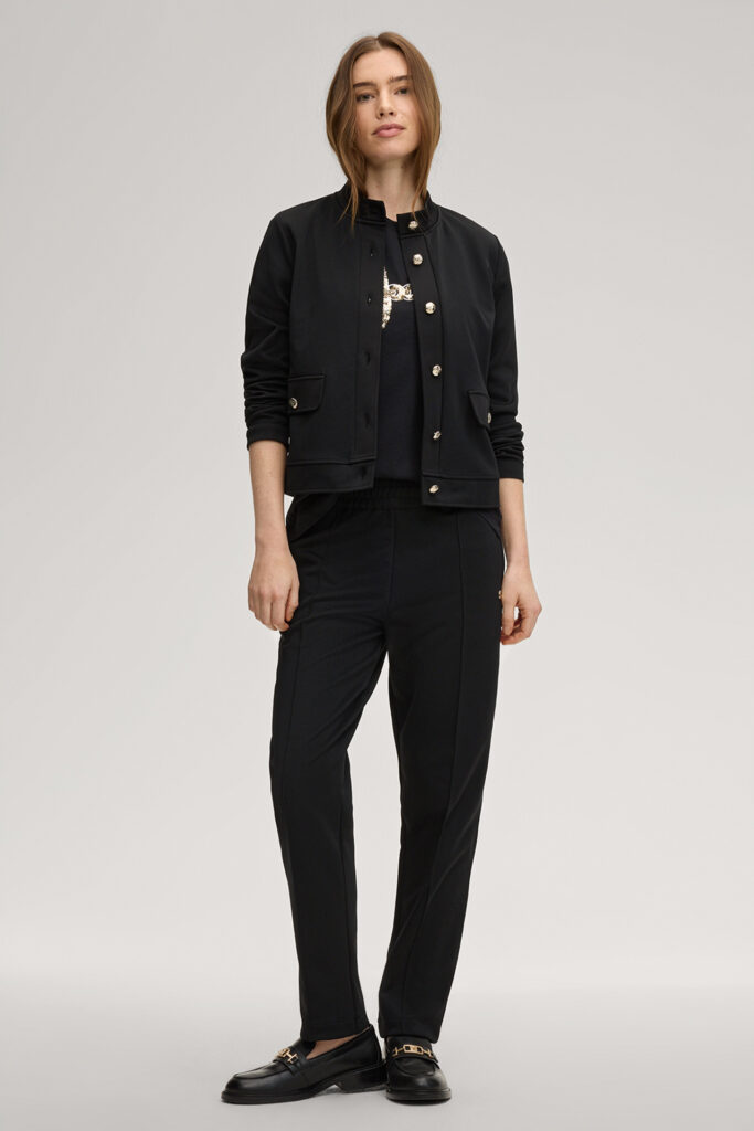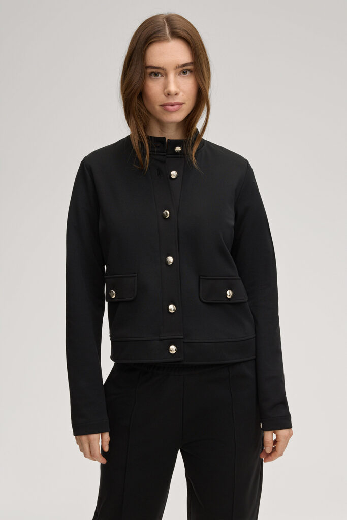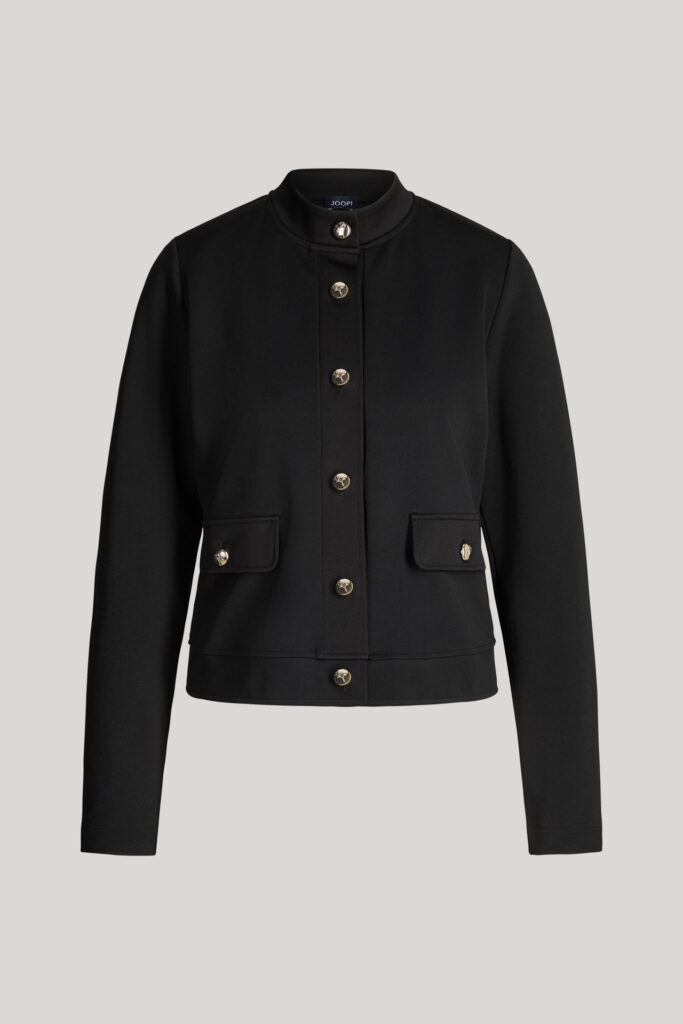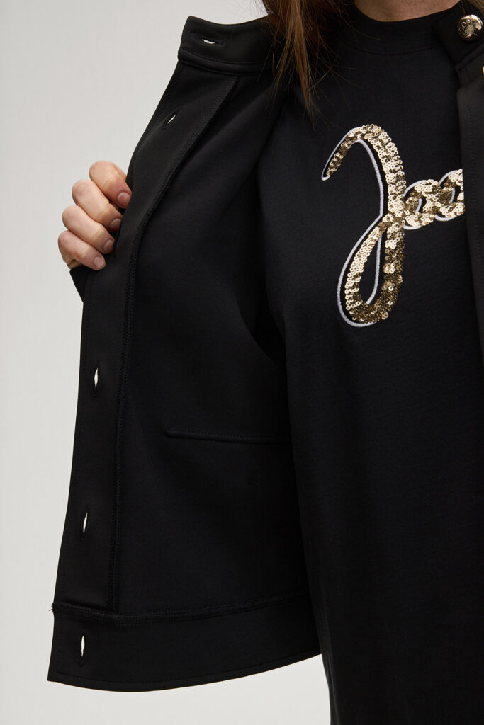 Vācu modes zīmola Joop! melna sieviešu sportiskā stila jaka ar paaugstinātu apkakli un pogu aizdari. Izgatavota no viegli elastīga kokvilnas maisījuma materiāla. Akcentēta ar dekoratīviem kabatu atlokiem, kā arī zelta krāsas zīmola pogām un smalku logo emblēmu pie apkakles mugurpusē.