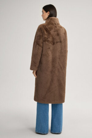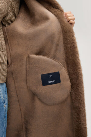 Vācu modes zīmola Joop! abpusēji nēsājams sieviešu mētelis kanēļa brūnā tonī. Izgatavots no īpaši mīkstas mākslīgās kažokādas. Papildināts ar slēptu spiedpogu aizdari un paaugstinātu apkakli. Nēsājams ar kažoka vai zamšādas tekstūras ārpusi, radod divus dažādus koptēlus.