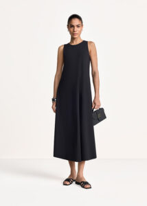 Itāļu modes zīmola Max Mara Leisure gara sieviešu kleita dūmakainā, olīvzaļā tonī. Izgatavota no blīva satīna auduma ar viegla burzījuma efektu, papildināta ar regulējamām, dekoratīvām mugurpuses un elastīgām plecu lencītēm.