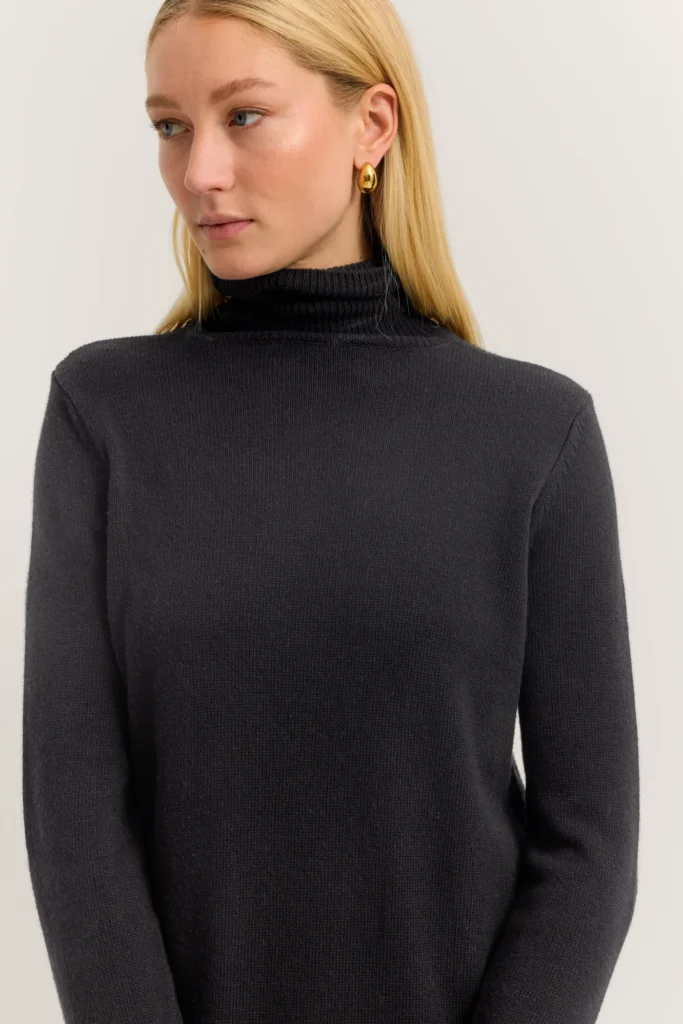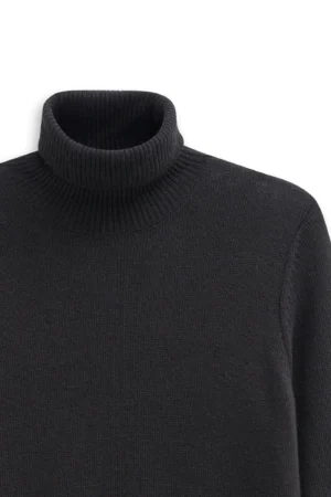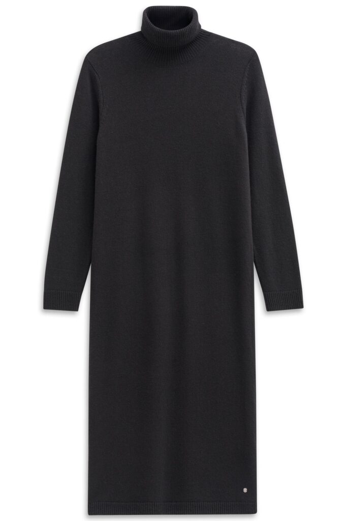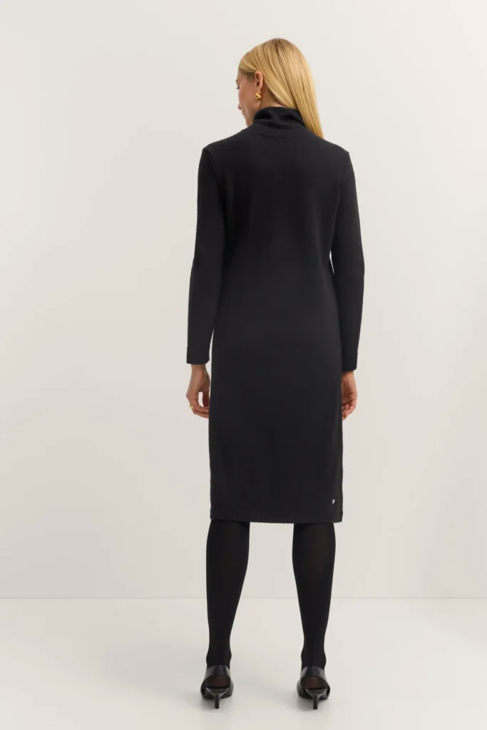 Vācu modes zīmola Bugatti melna sieviešu džemperkleita ar augstu atlokāmo apkakli. Izgatavota no mīkstas vilnas, viskozes un kašmira maisījuma dzijas. Papildināta ar rievotu apdari, kā arī smalku zīmola logotipa akcentu apakšmalā.