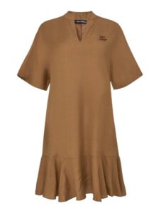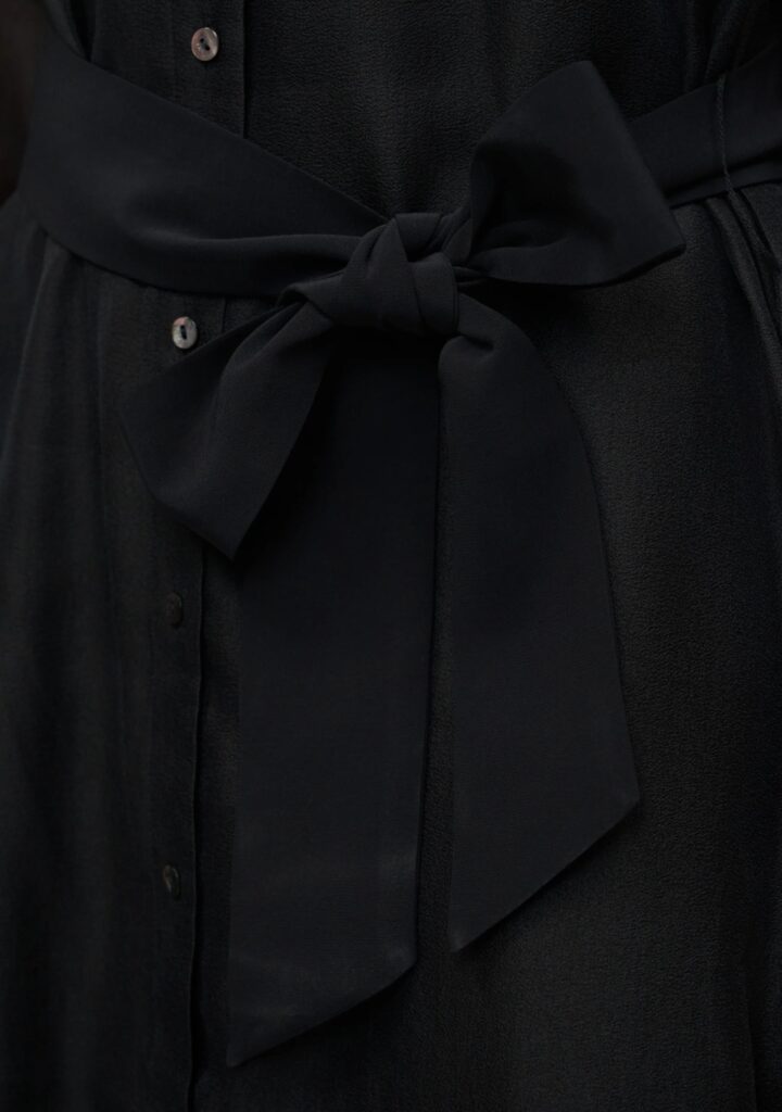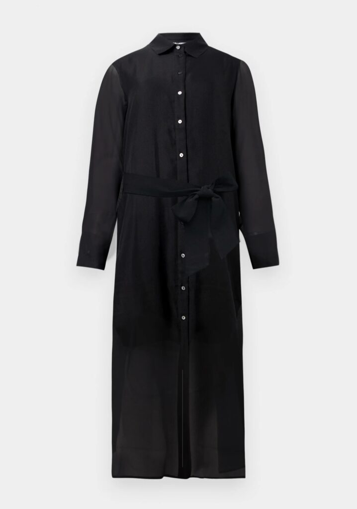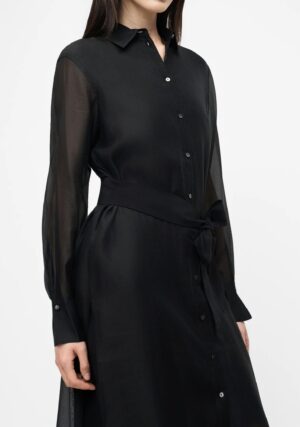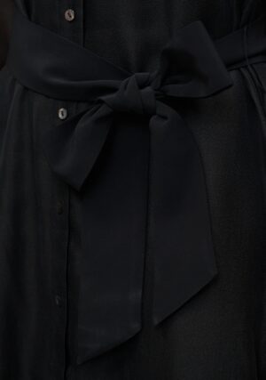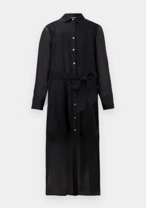 Vācu luksusa zīmola Karl Lagerfeld gaisīga sieviešu kreklveida kleita melnā krāsā. Izgatavota no viegla un plūstoša kupro auduma. Papildināta ar viskozes apakškleitu, sānu šķēlumiem un sasienamu jostu. Akcentēta ar izsmalcinātām zīmola perlamutra pogām, kā arī logo monogrammas vientoņa izšuvumu uz aproces.