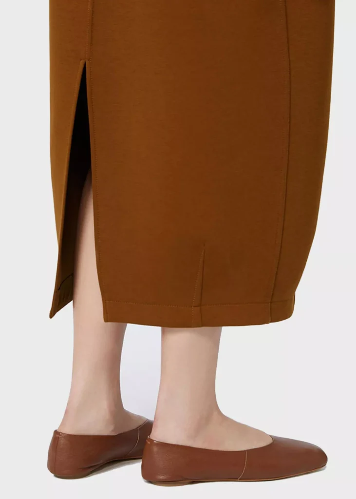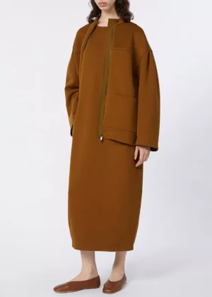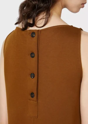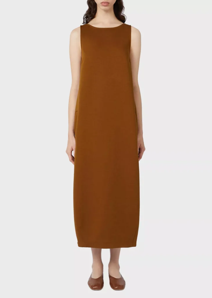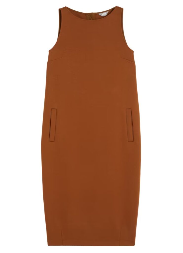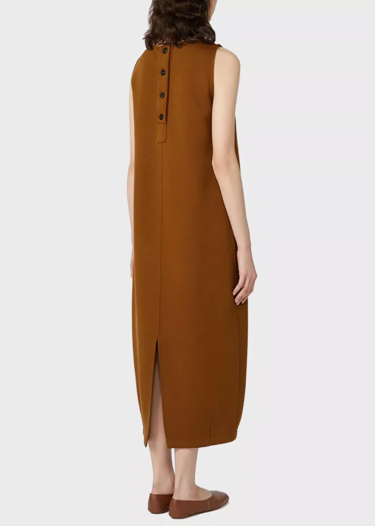 Itāļu modes zīmola MM by Max Mara gara sieviešu O silueta kleita bez piedurknēm zeltaini brūnā krāsā. Izgatavota no blīva un bieza kokvilnas maisījuma materiāla. Papildināta ar iešūtām sānu kabatām un pogu aizdari mgurpusē.