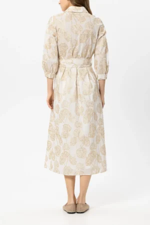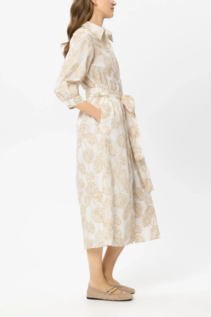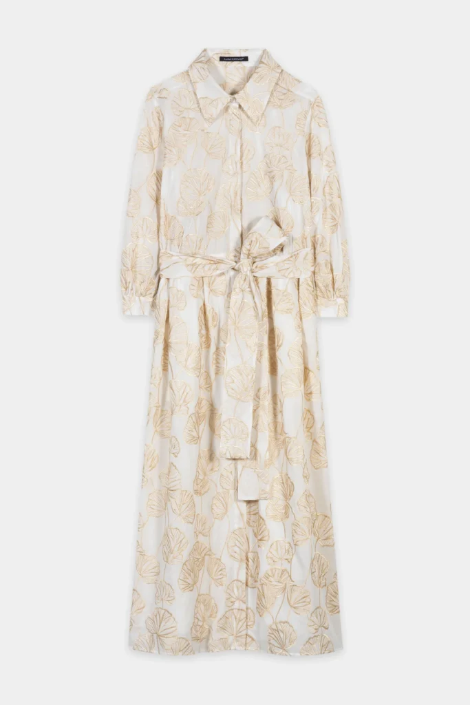 Vācu premium klases apģērbu zīmola Luisa Cerano sieviešu kreklveida kleita ar slēptu pogu aizdari. Izgatavota no smalka kokvilnas maisījuma materiāla ar zeltaini bēšu izšuvumu rakstu. Papildināta ar saīsināta garuma piedurknēm, iešūtām sānu kabatām un platu sasienamo jostu.