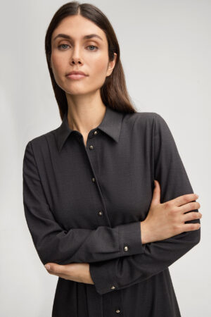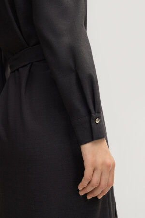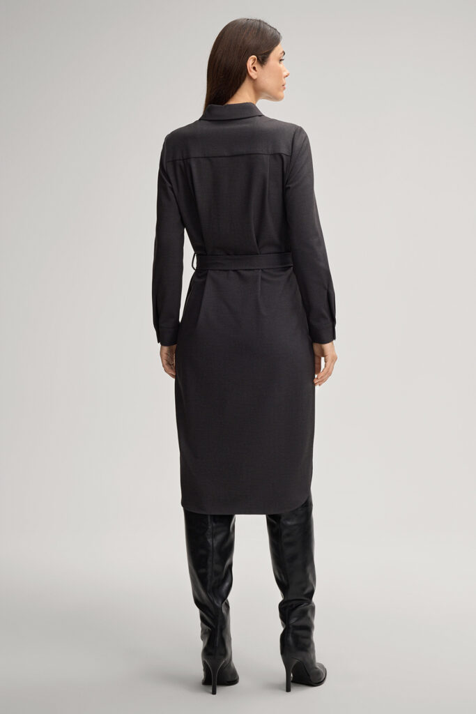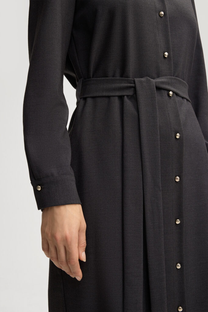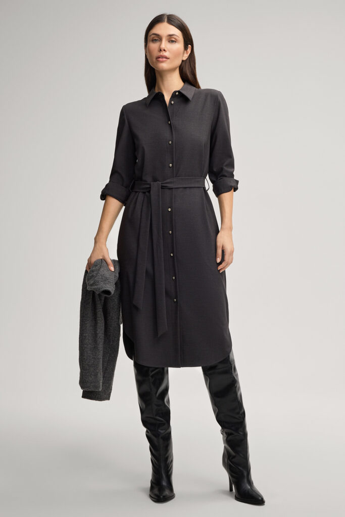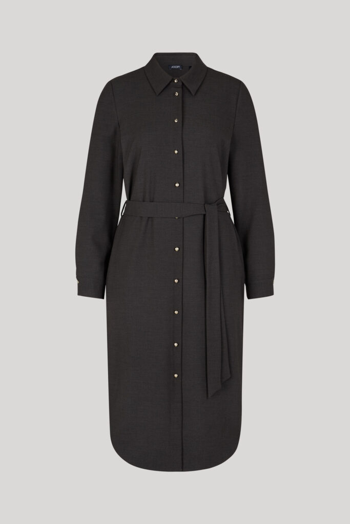 Vācu modes zīmola Joop! sieviešu kreklveida kleita ar sasienamu jostu tumši pelēkā krāsā. Izgatavota no viskozes un vilnas maisījuma flaneļa auduma. Papildināta ar zīmola logotipa zelta krāsas pogu aizdari un noapaļotu apakšmalu.