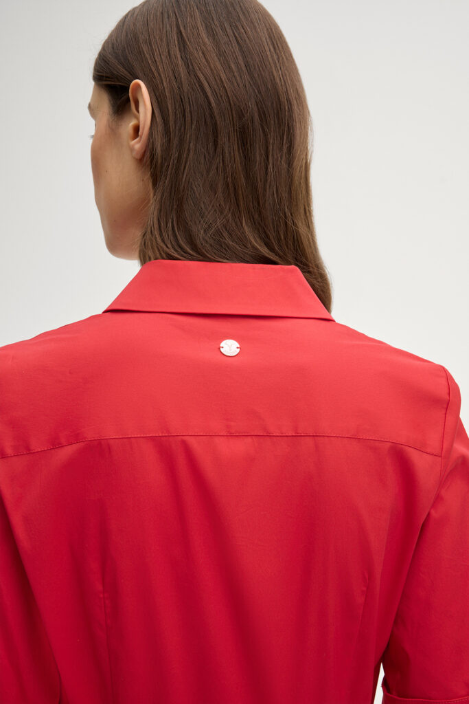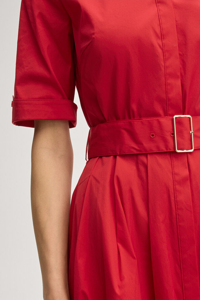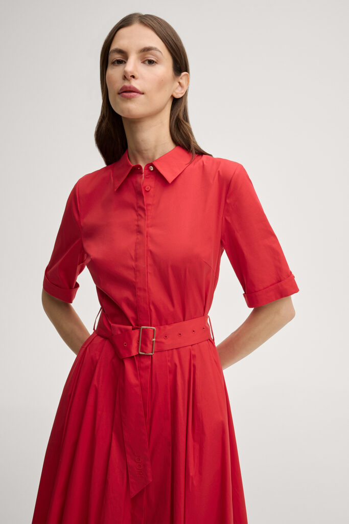 Vācu modes zīmola Joop! sarkana sieviešu kreklveida kleita ar īsām piedurknēm un sprādzējamu jostu. Izgatavota no kokvilnas maisījuma poplīna auduma. Papildināta ar slēptu pogu aizdari, dekoratīvām ielocēm jostasvietā un iešūtām sānu kabatām. Akcentēta ar zelta krāsas metāla un zīmola logotipa detaļām.